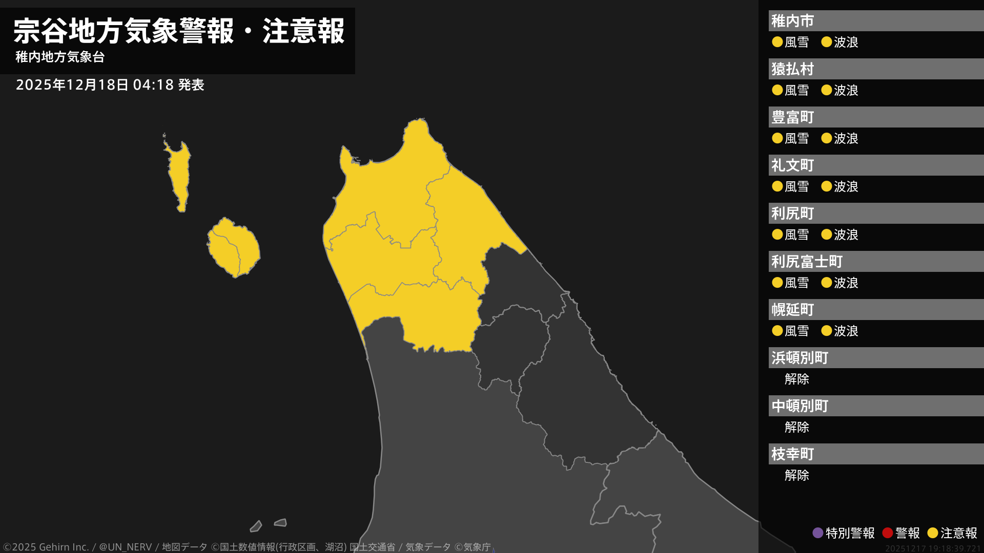 【宗谷地方 気象警報・注意報 2025年12月18日 04:18】宗谷地方では、18日昼前まで風雪や高波に注意してください。#気象警報注意報 #宗谷地方