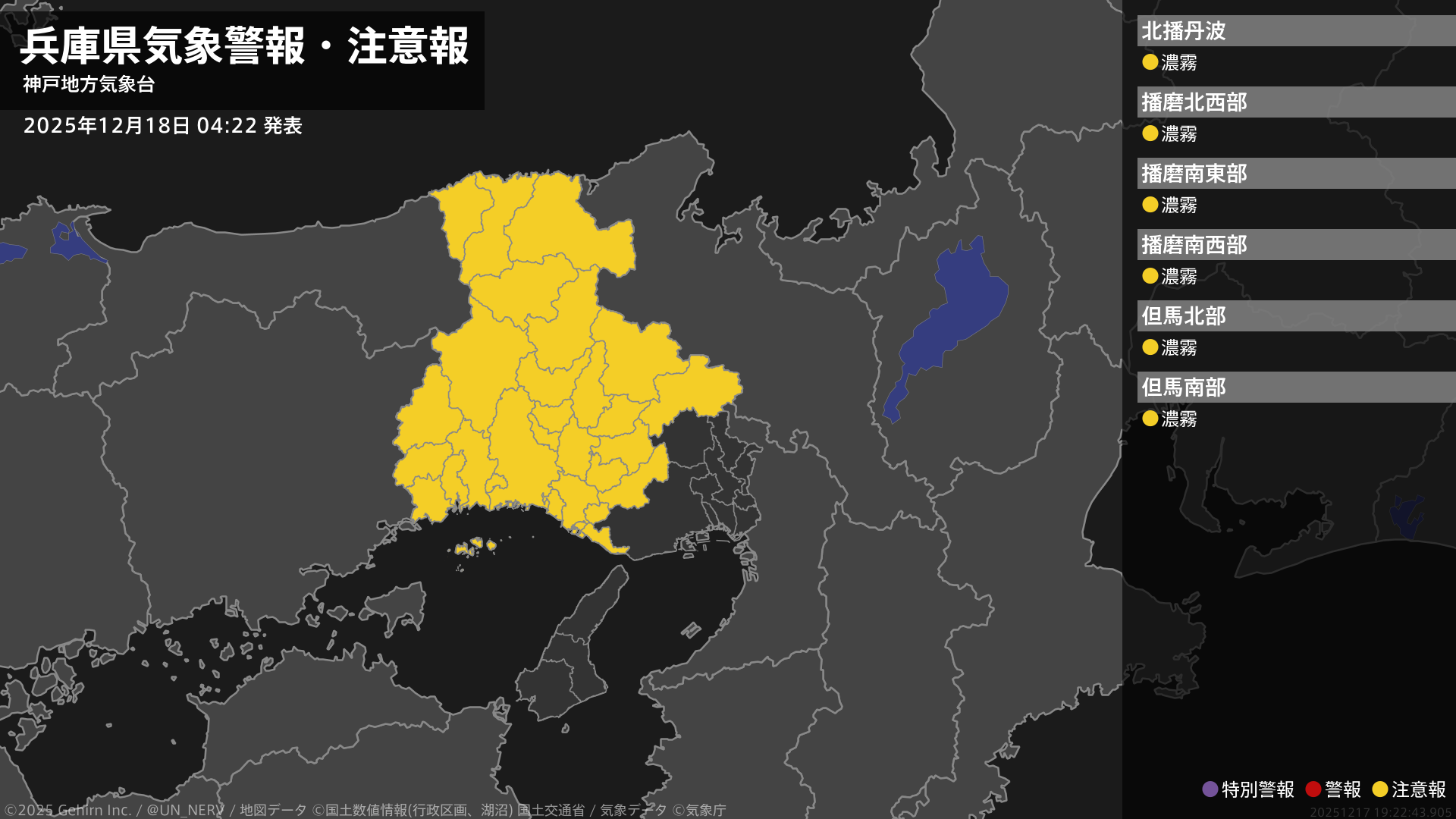 【兵庫県 気象警報・注意報 2025年12月18日 04:22】兵庫県では、18日昼前まで濃霧による視程障害に注意してください。#気象警報注意報 #兵庫県