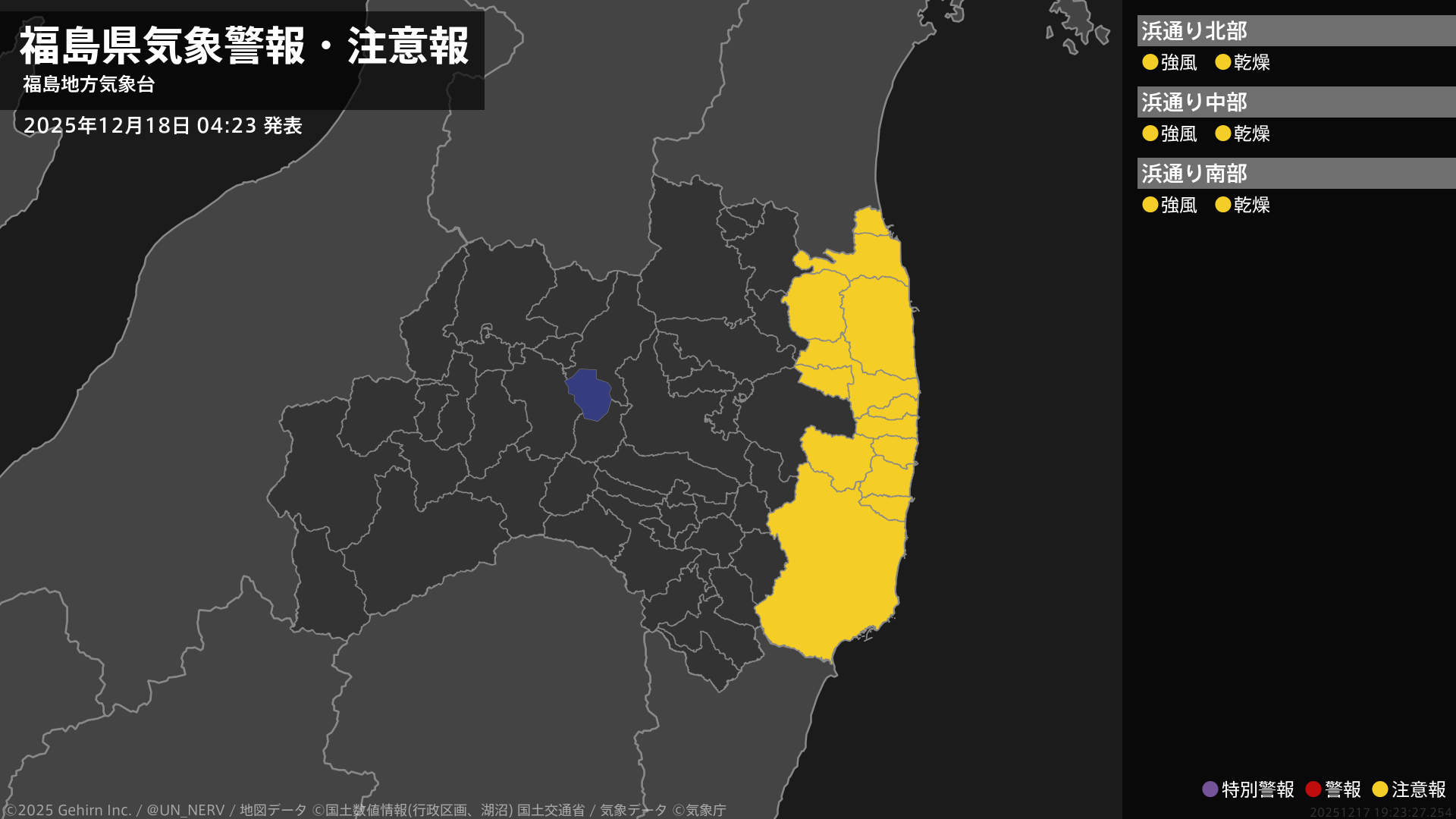 【福島県 気象警報・注意報 2025年12月18日 04:23】浜通りでは、18日昼前まで強風に、18日まで空気の乾燥した状態が続くため、火の取り扱いに注意してください。#気象警報注意報 #福島県