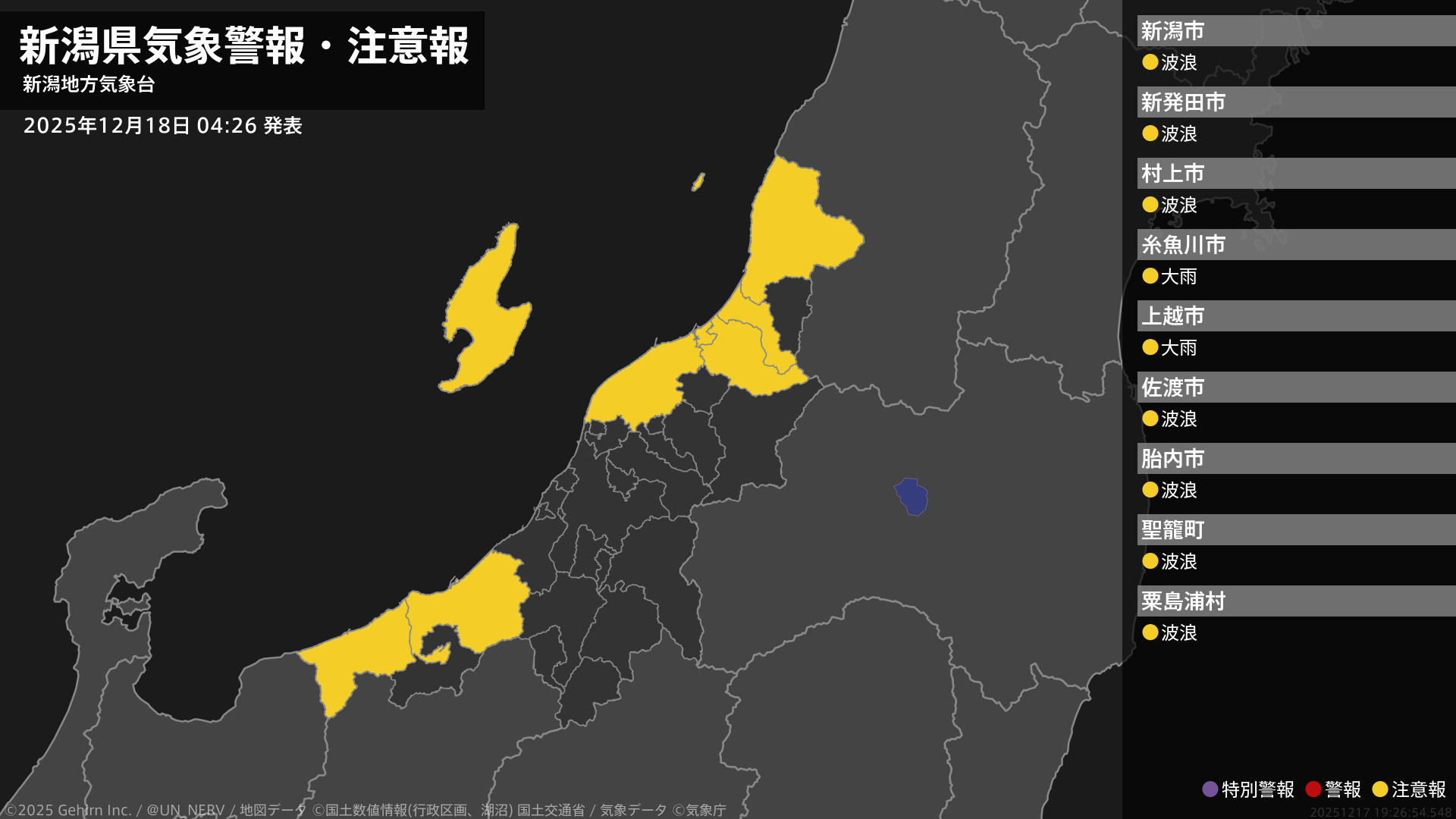【新潟県 気象警報・注意報 2025年12月18日 04:26】上越では、18日朝まで土砂災害に注意してください。下越、佐渡では、18日夕方まで高波に注意してください。#気象警報注意報 #新潟県