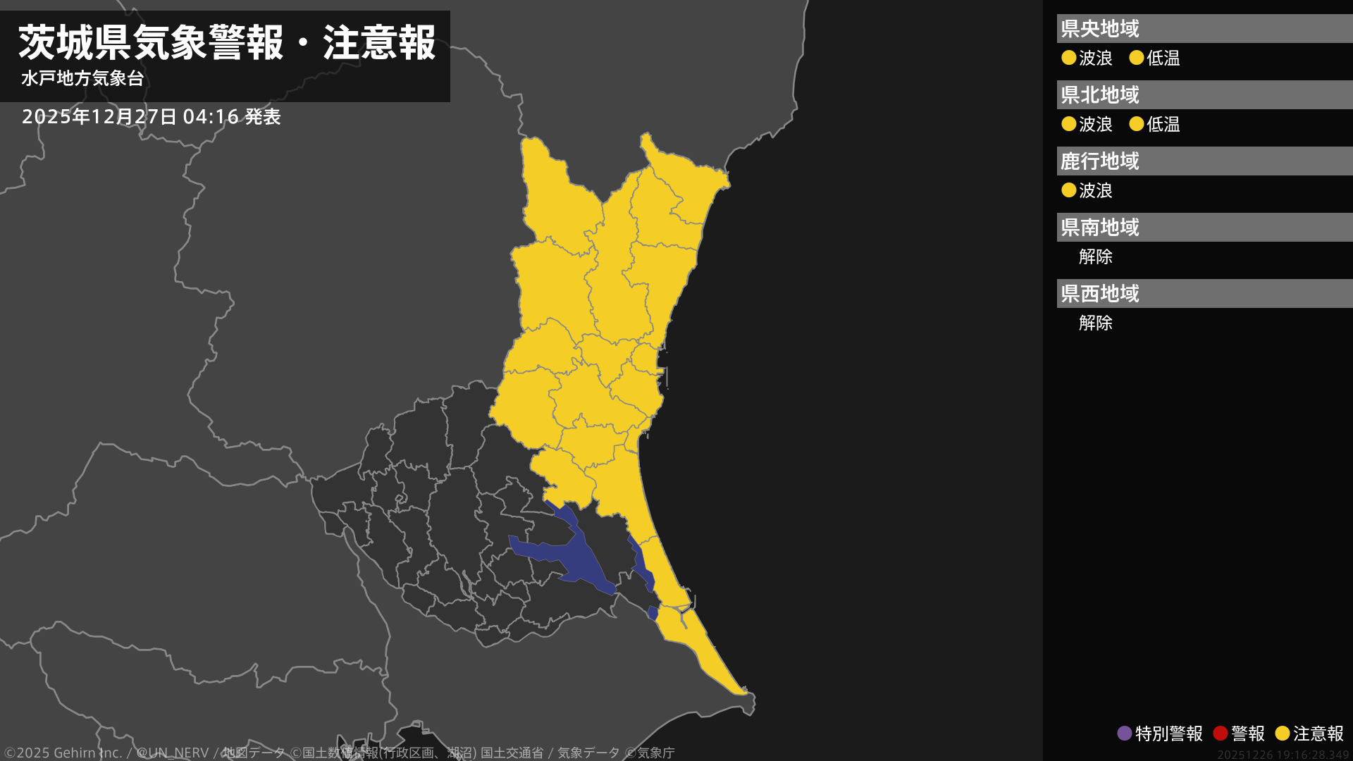 【茨城県 気象警報・注意報 2025年12月27日 04:16】茨城県では、27日昼前まで高波に注意してください。北部では、27日まで低温に注意してください。#気象警報注意報 #茨城県