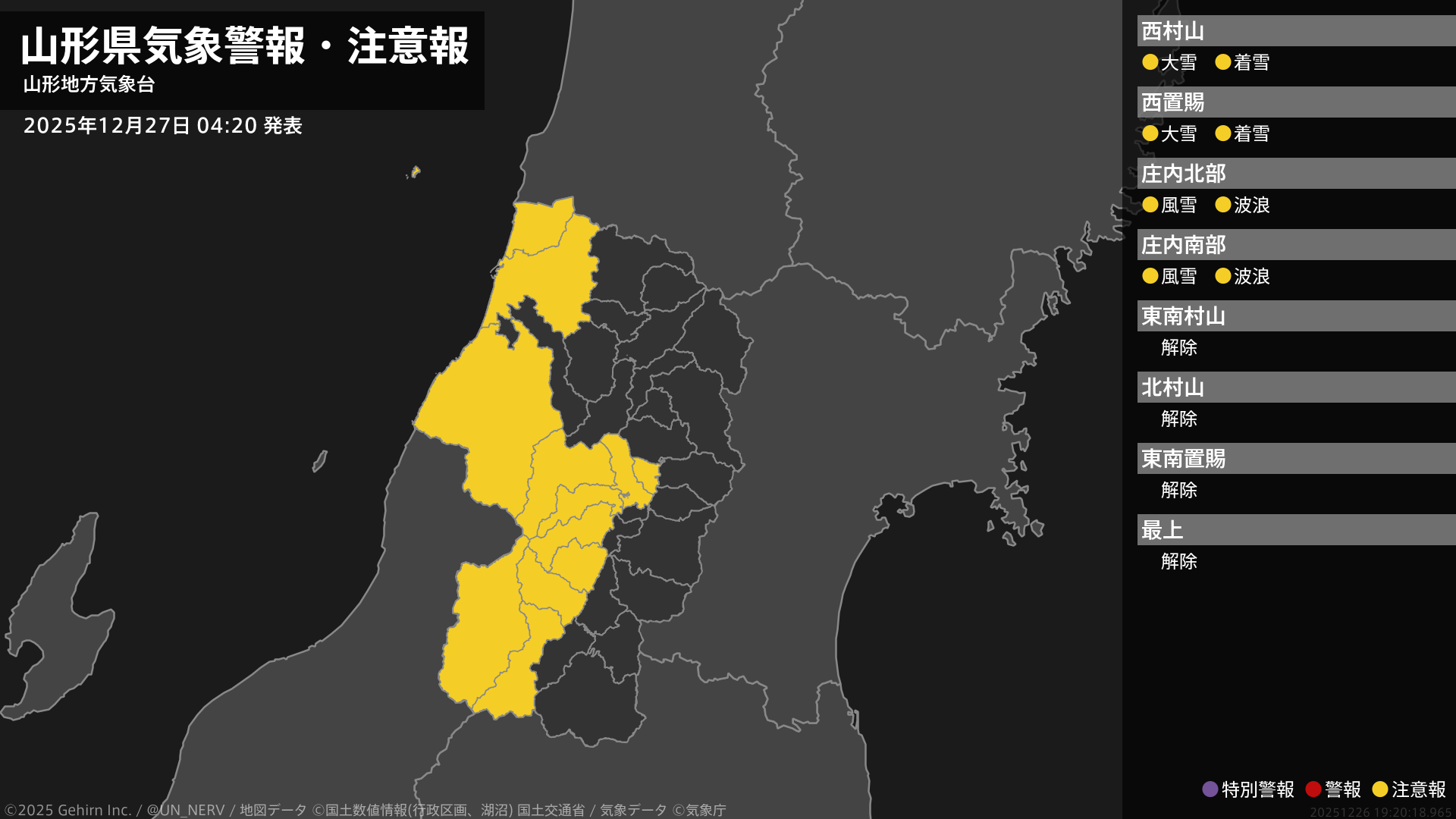 【山形県 気象警報・注意報 2025年12月27日 04:20】庄内では、風雪や高波に注意してください。村山、置賜では、大雪や電線等への着雪に注意してください。#気象警報注意報 #山形県
