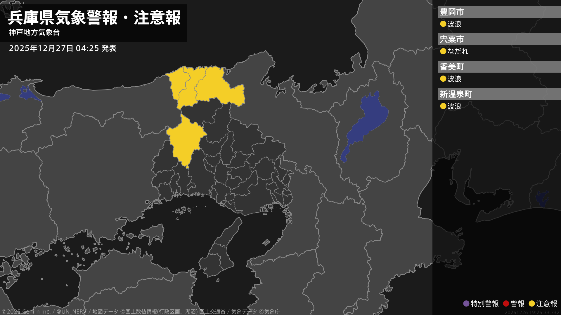【兵庫県 気象警報・注意報 2025年12月27日 04:25】北部では、27日夕方まで高波に注意してください。南部では、27日までなだれに注意してください。#気象警報注意報 #兵庫県