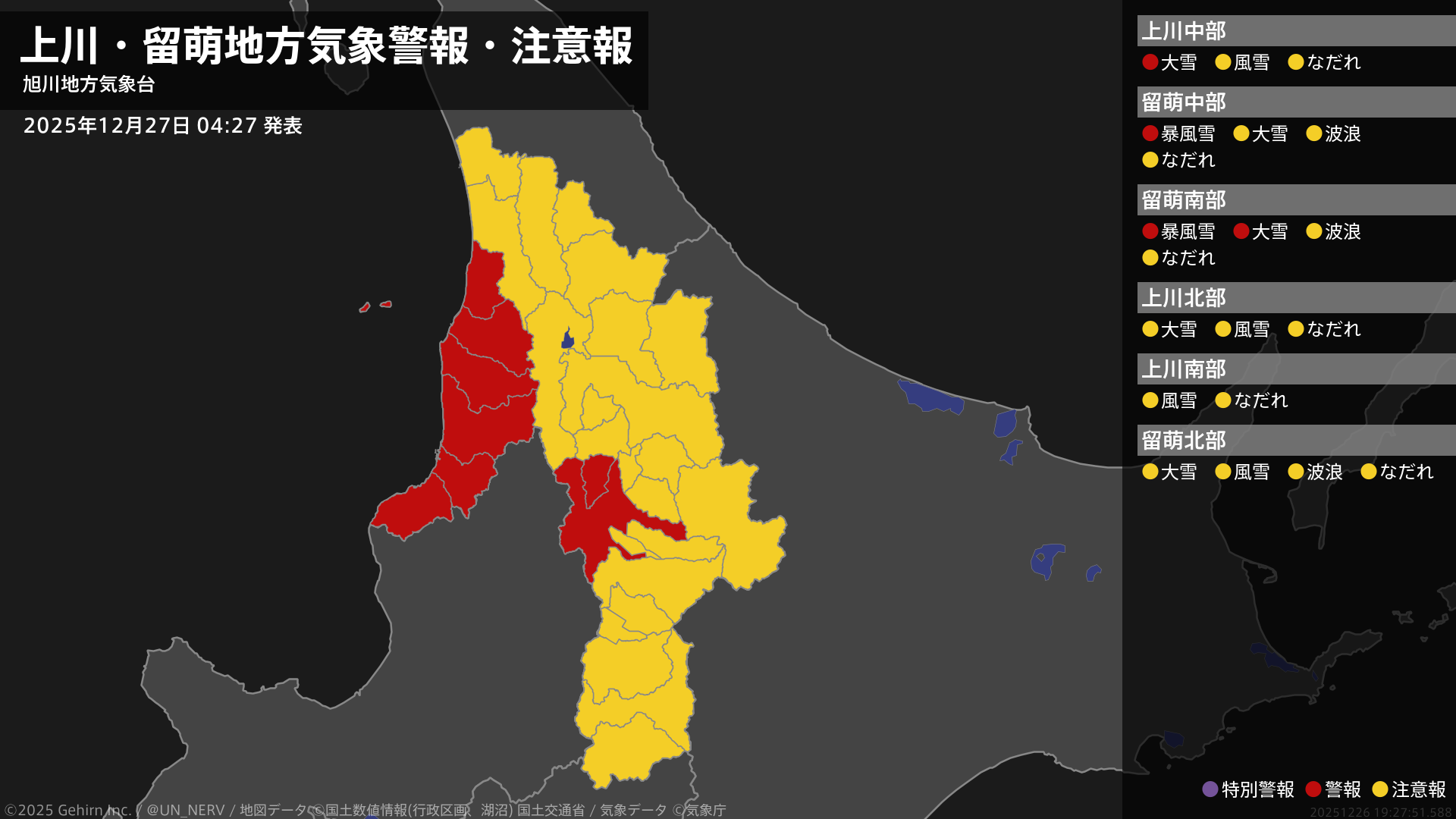 【上川・留萌地方 気象警報・注意報 2025年12月27日 04:27】留萌地方では、27日夕方まで暴風雪に警戒してください。上川、留萌地方では、27日朝まで大雪に警戒してください。#気象警報注意報 #上川地方 #留萌地方