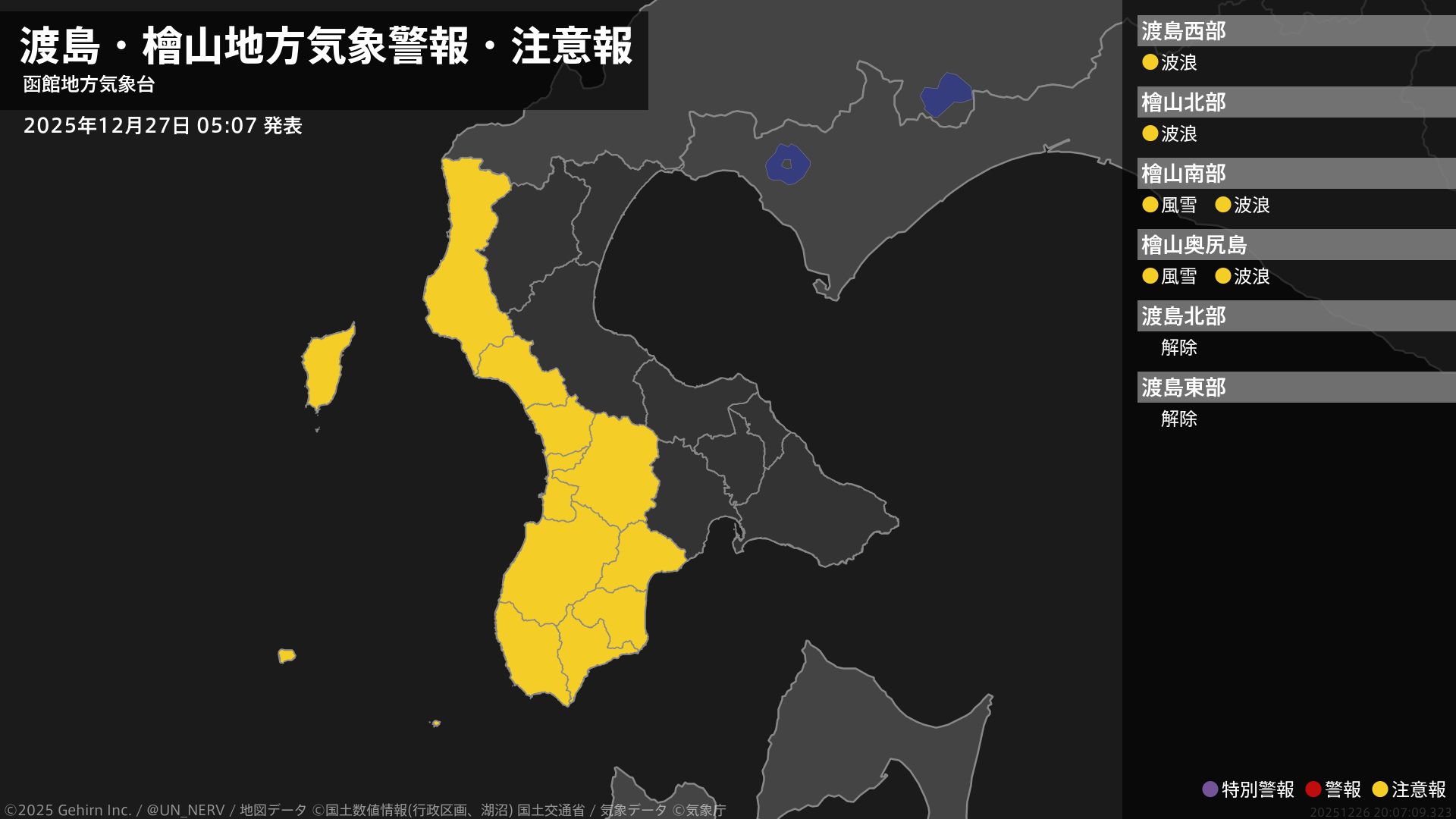 【渡島・檜山地方 気象警報・注意報 2025年12月27日 05:07】檜山地方では、風雪に注意してください。渡島、檜山地方では、高波に注意してください。#気象警報注意報 #渡島地方 #檜山地方