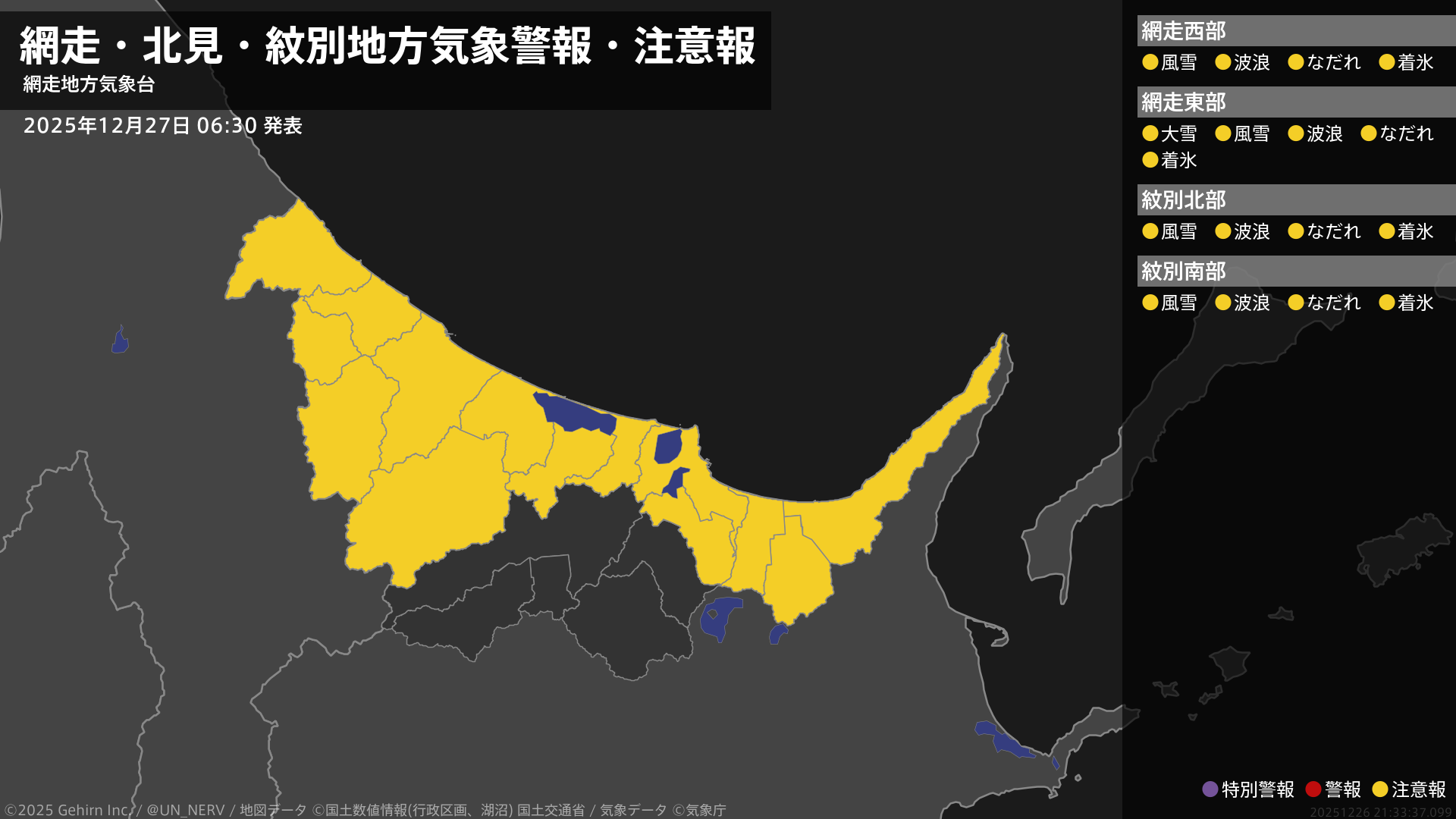 【網走・北見・紋別地方 気象警報・注意報 2025年12月27日 06:33】網走、紋別地方では、風雪や高波、なだれ、着氷に注意してください。網走地方では、大雪に注意してください。#気象警報注意報 #網走・北見・紋別地方