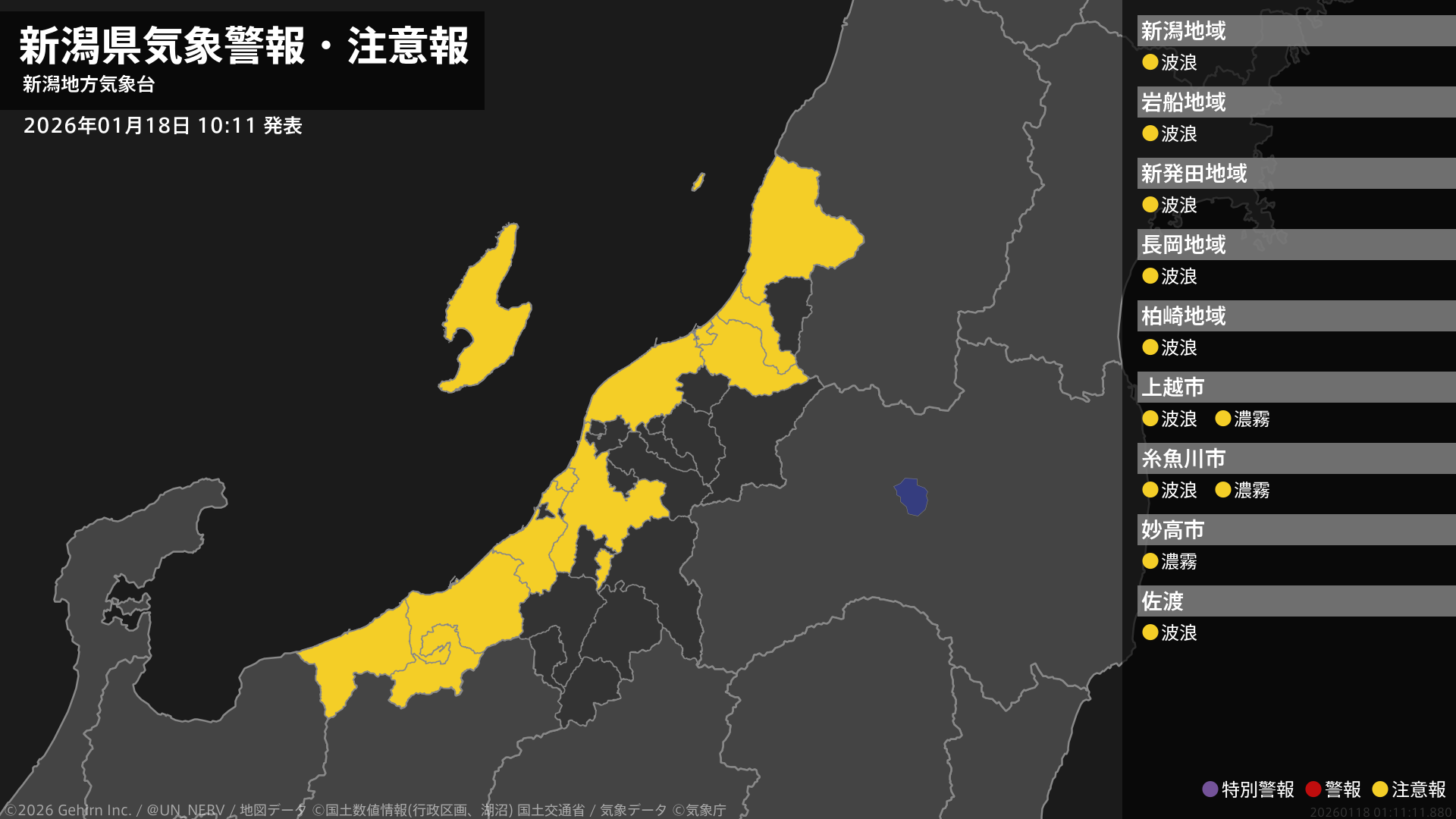 【新潟県 気象警報・注意報 2026年01月18日 10:11】中越、上越では18日昼過ぎまで、下越、佐渡では18日夜のはじめ頃まで、高波に注意してください。上越では、18日夕方まで濃霧による視程障害に注意してください。#気象警報注意報 #新潟県