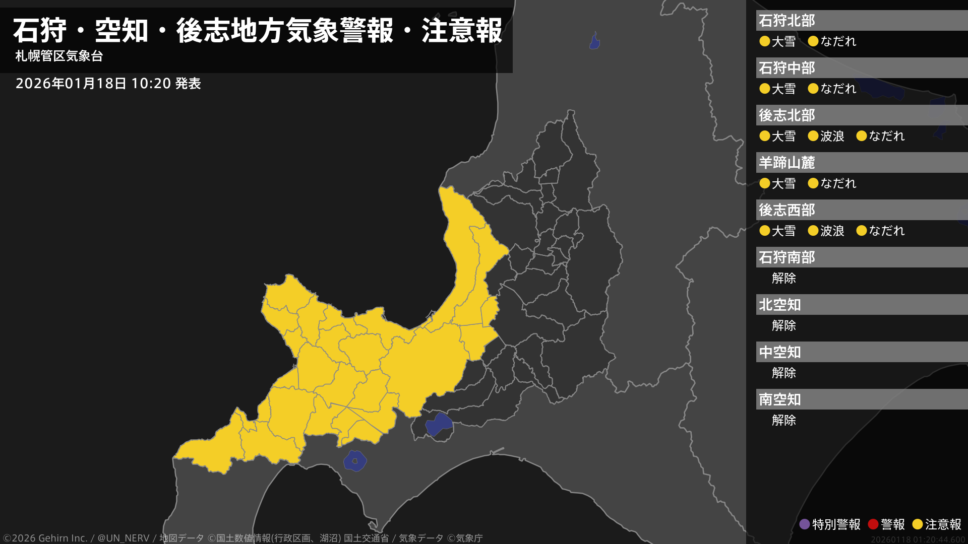 【石狩・空知・後志地方 気象警報・注意報 2026年01月18日 10:20】石狩、後志地方では、18日夕方まで大雪に、18日までなだれに注意してください。後志地方では、18日夕方まで高波に注意してください。#気象警報注意報 #石狩地方 #空知地方 #後志地方