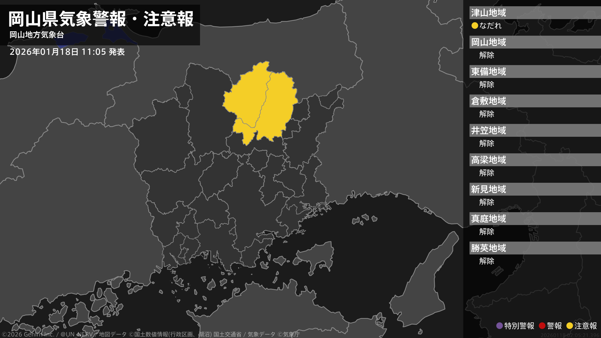 【岡山県 気象警報・注意報 2026年01月18日 11:05】北部では、18日までなだれに注意してください。#気象警報注意報 #岡山県