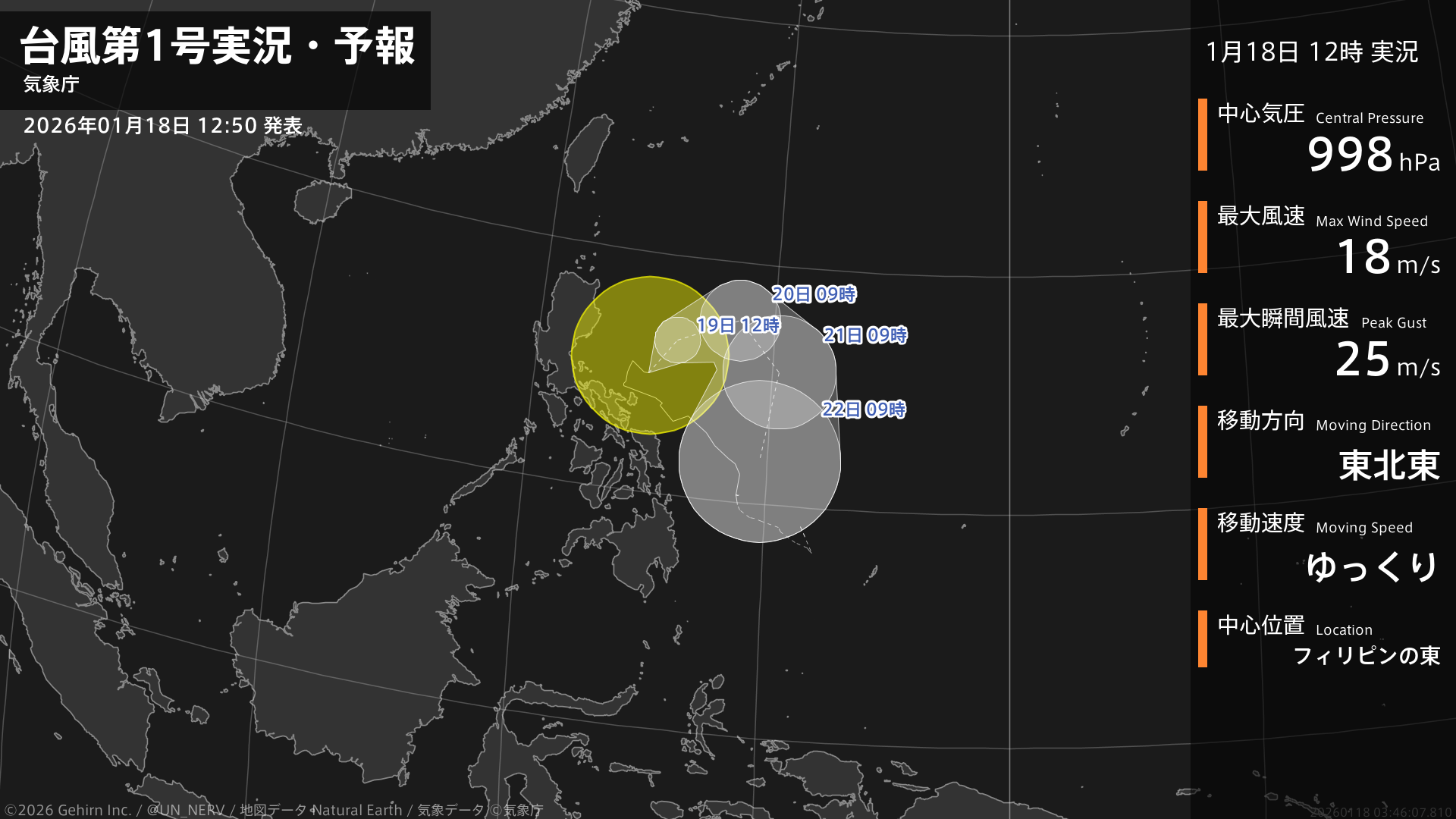 【台風第1号実況・予報 2026年01月18日 12:46】台風第1号(ノケーン)は、フィリピンの東をゆっくりと東北東に進んでいます。#台風情報