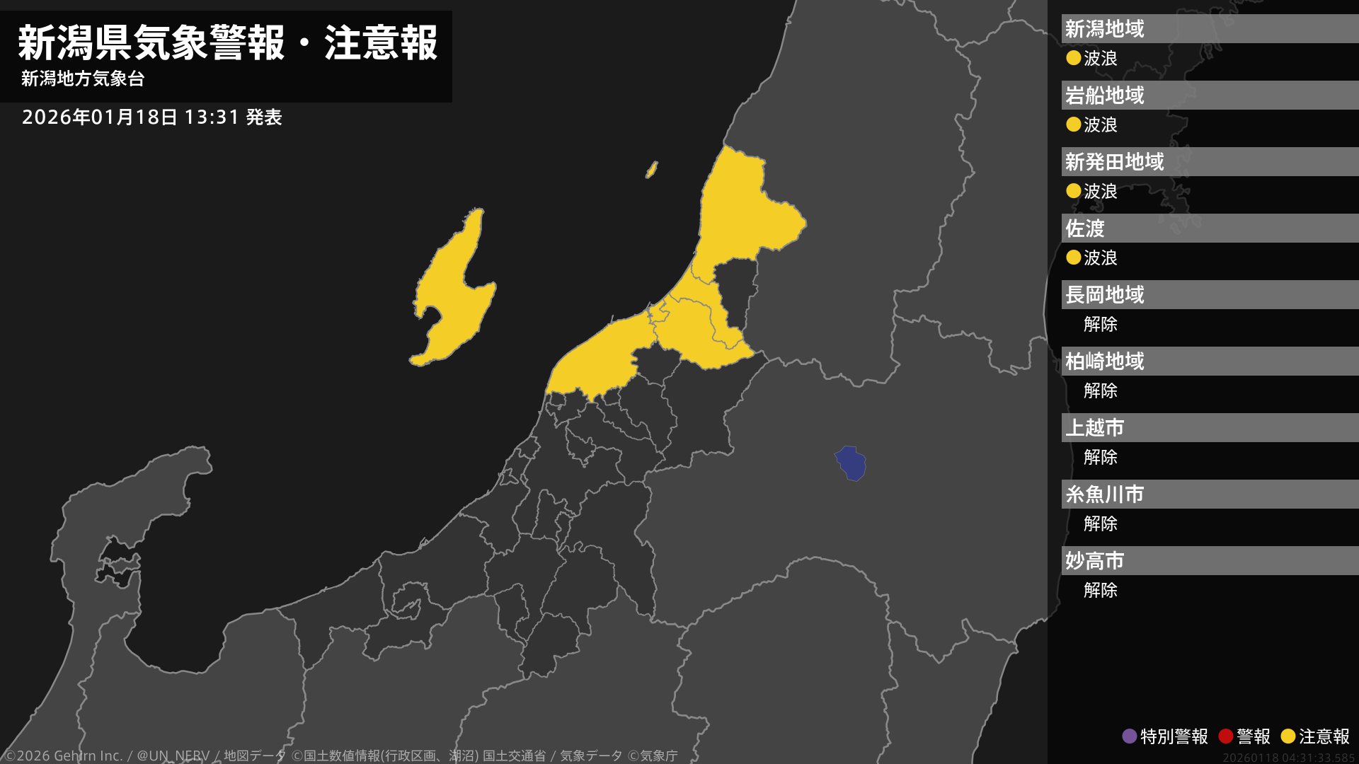 【新潟県 気象警報・注意報 2026年01月18日 13:31】下越、佐渡では、18日夜のはじめ頃まで高波に注意してください。#気象警報注意報 #新潟県