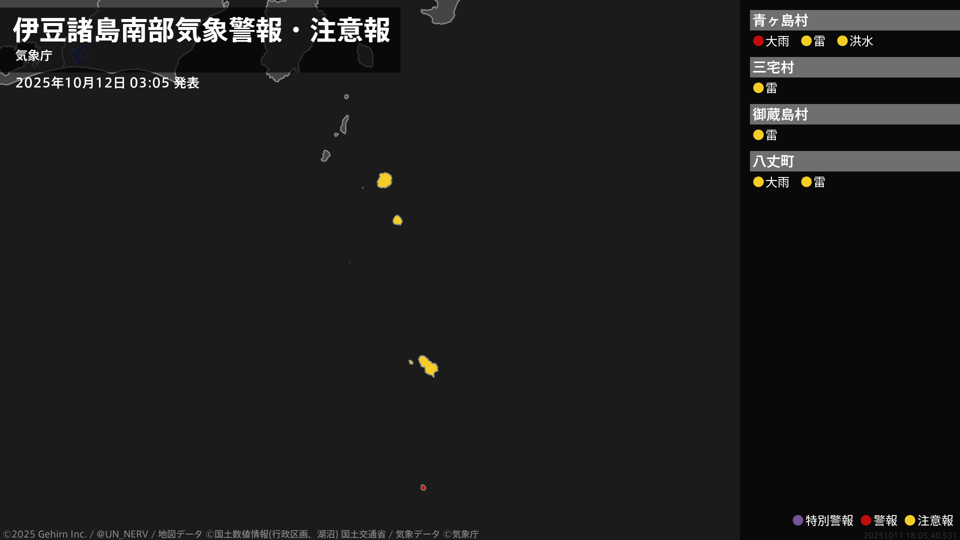 【東京都 気象警報・注意報 2025年10月12日 03:05】伊豆諸島南部では、土砂災害に警戒してください。#気象警報注意報 #東京都