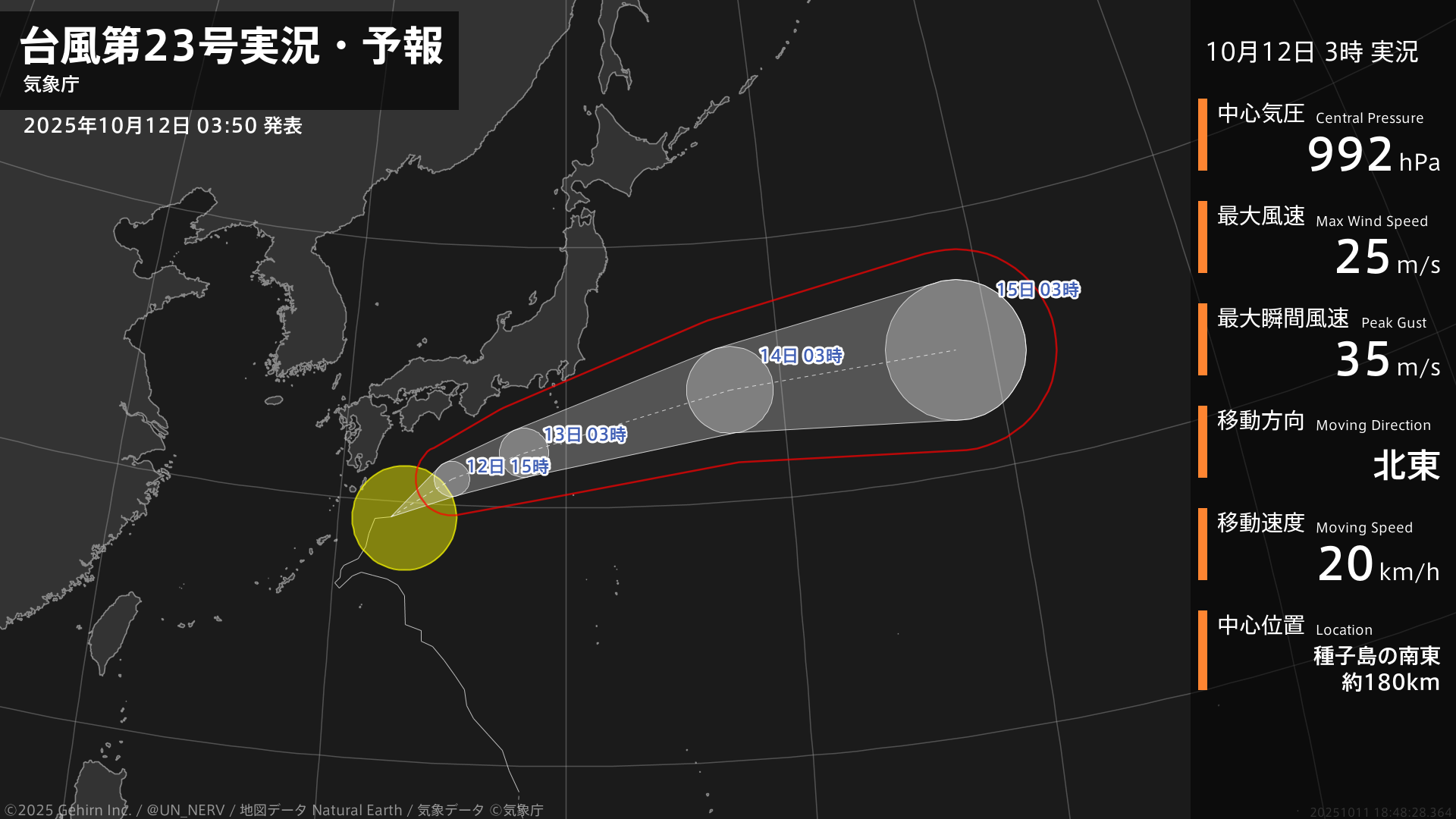 【台風第23号実況・予報 2025年10月12日 03:48】台風第23号(ナクリー)は、種子島の南東約180kmを1時間に20キロの速さで北東に進んでいます。#台風情報