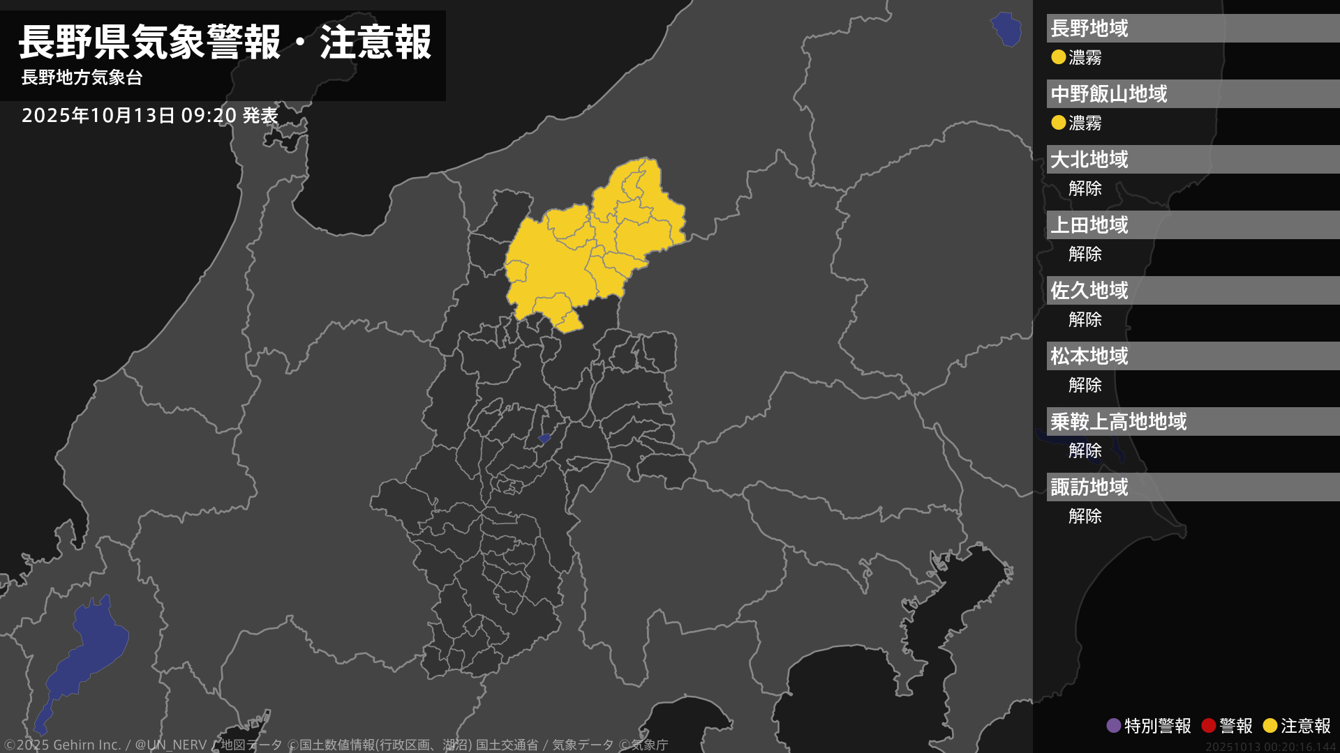 【長野県 気象警報・注意報 2025年10月13日 09:20】北部では、13日昼前まで濃霧による視程障害に注意してください。#気象警報注意報 #長野県