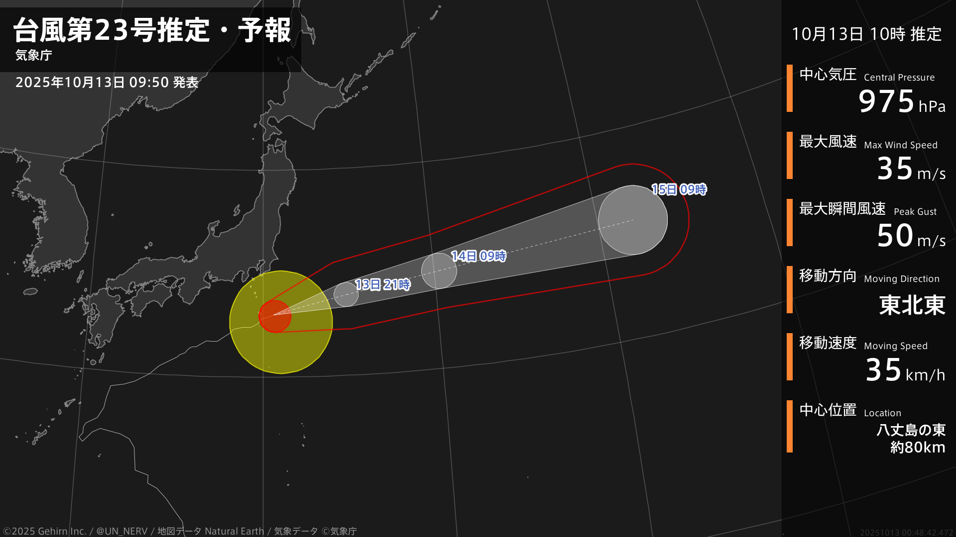 【台風第23号推定・予報 2025年10月13日 09:48】強い台風第23号(ナクリー)は、八丈島の東約80kmを1時間に35キロの速さで東北東に進んでいるとみられます。#台風情報