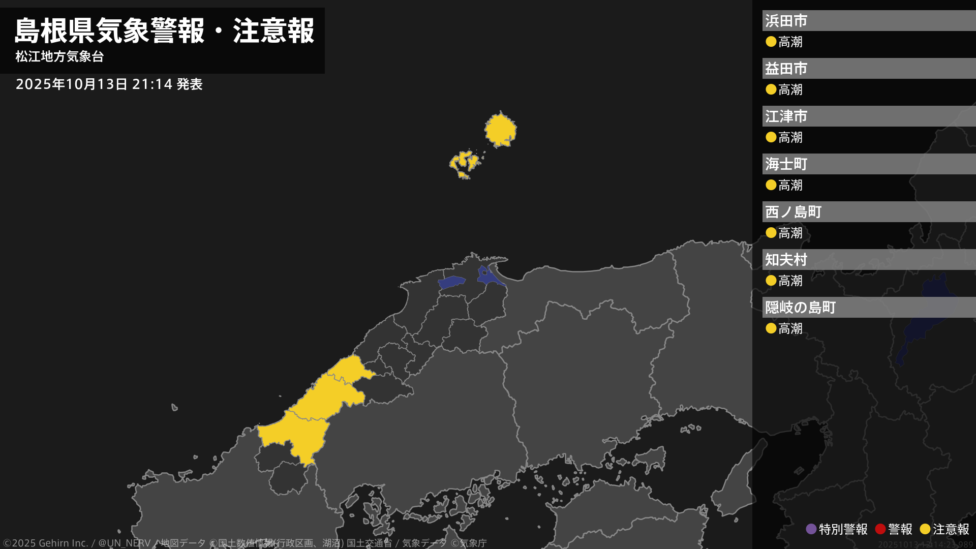 【島根県 気象警報・注意報 2025年10月13日 21:14】西部、隠岐では、14日明け方から14日朝まで高潮に注意してください。#気象警報注意報 #島根県