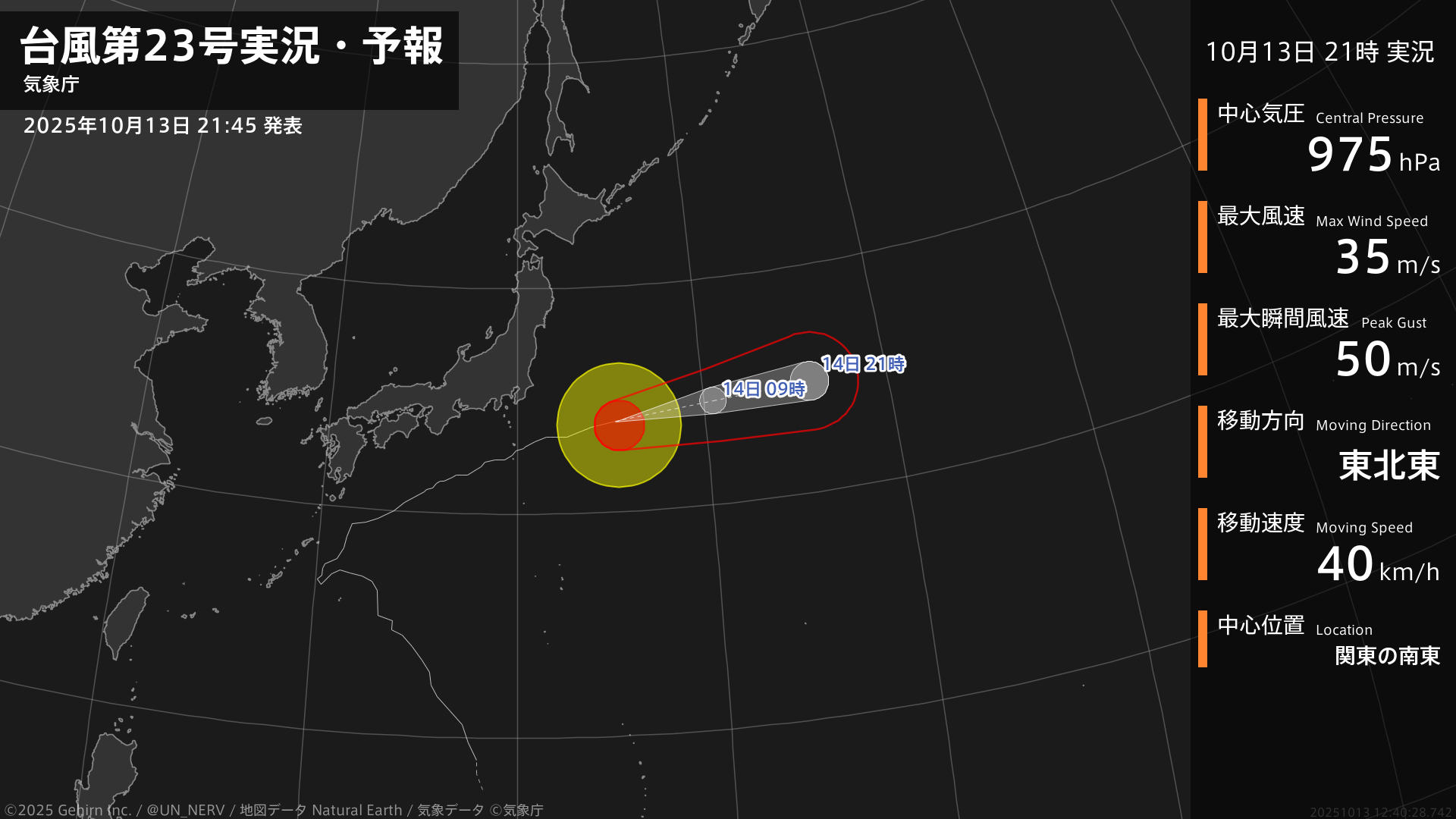 【台風第23号実況・予報 2025年10月13日 21:40】強い台風第23号(ナクリー)は、関東の南東を1時間に40キロの速さで東北東に進んでいます。#台風情報