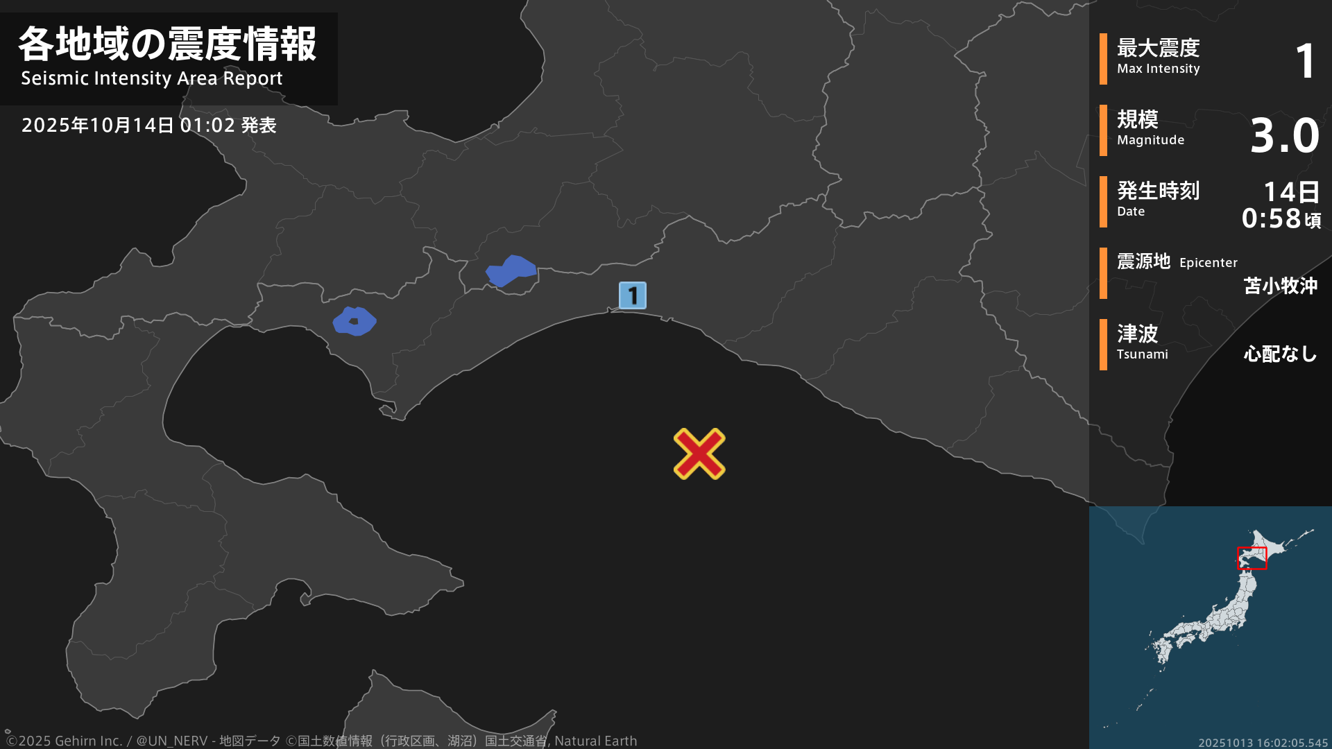 【地震情報 2025年10月14日】0時58分頃、苫小牧沖を震源とする地震がありました。震源の深さは約40km、地震の規模はM3.0、最大震度1を北海道で観測しています。この地震による津波の心配はありません。#地震 #北海道