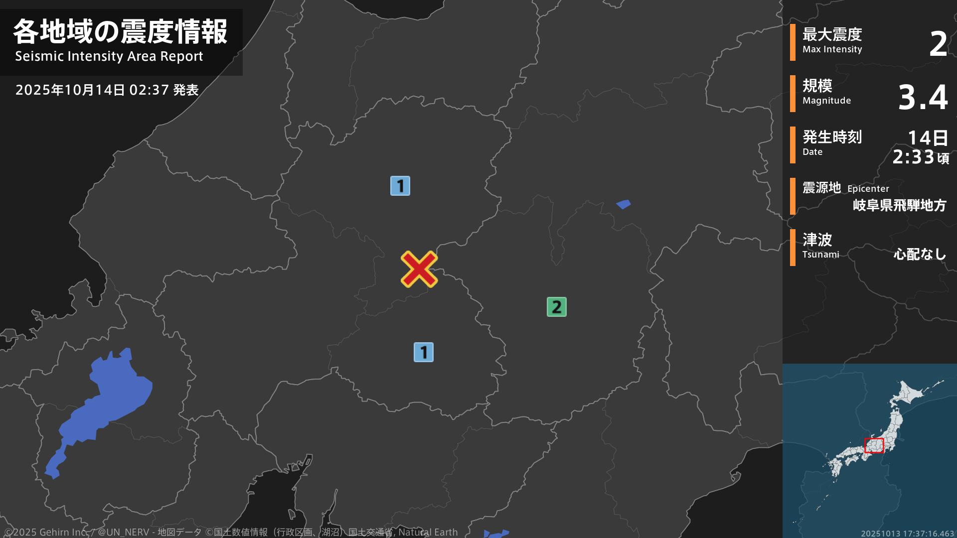 【地震情報 2025年10月14日】2時33分頃、岐阜県飛騨地方を震源とする地震がありました。震源の深さは約10km、地震の規模はM3.4、最大震度2を長野県で観測しています。この地震による津波の心配はありません。#地震 #長野県 #岐阜県