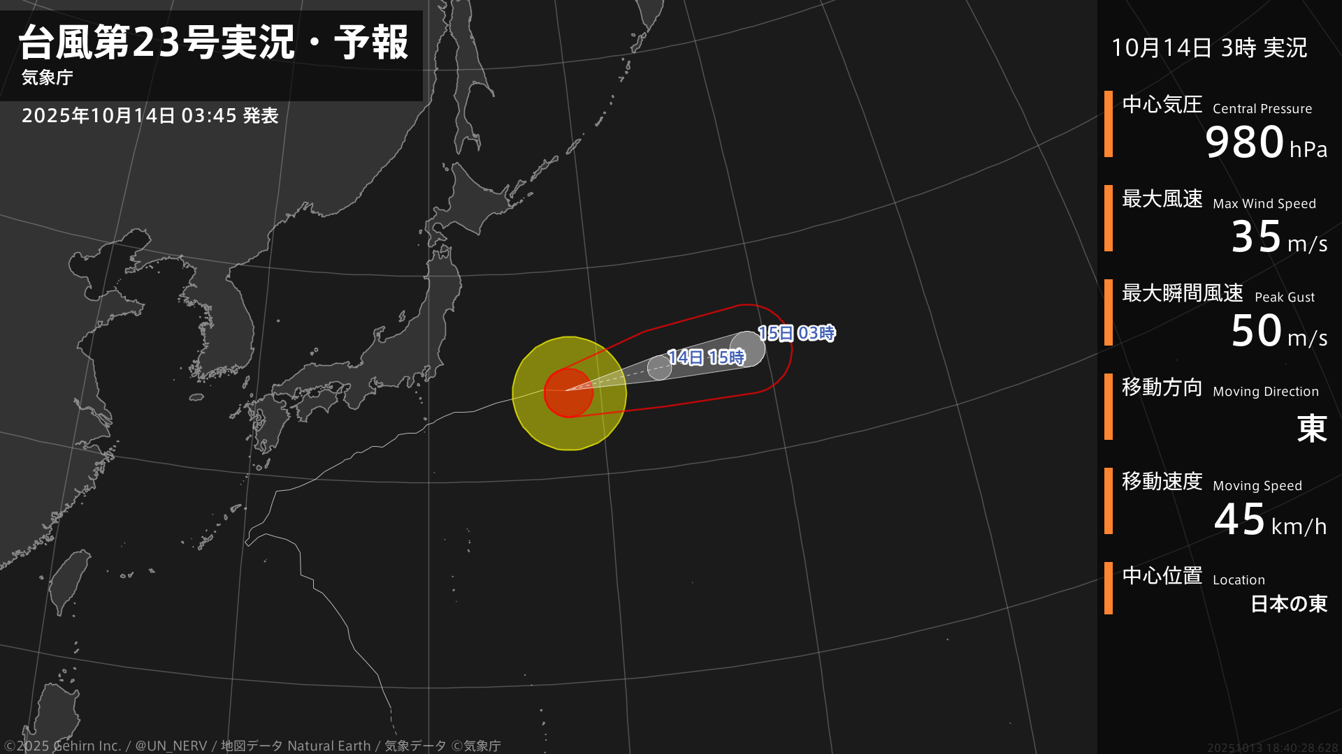 【台風第23号実況・予報 2025年10月14日 03:40】強い台風第23号(ナクリー)は、日本の東を1時間に45キロの速さで東に進んでいます。#台風情報