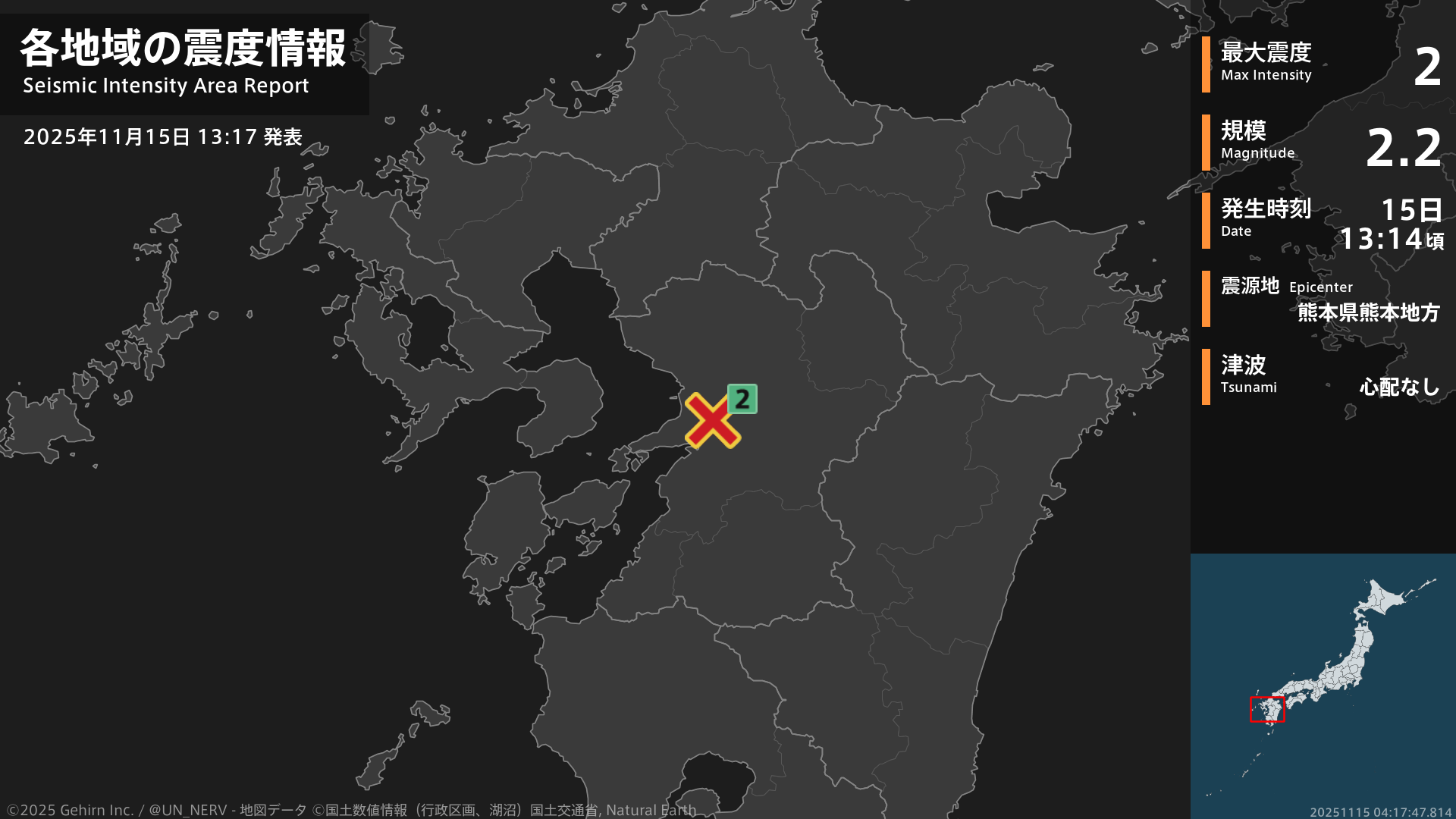 13時14分頃、熊本県熊本地方を震源とする地震がありました。震源の深さは約10km、地震の規模はM2.2、最大震度2を熊本県で観測しています。この地震による津波の心配はありません。