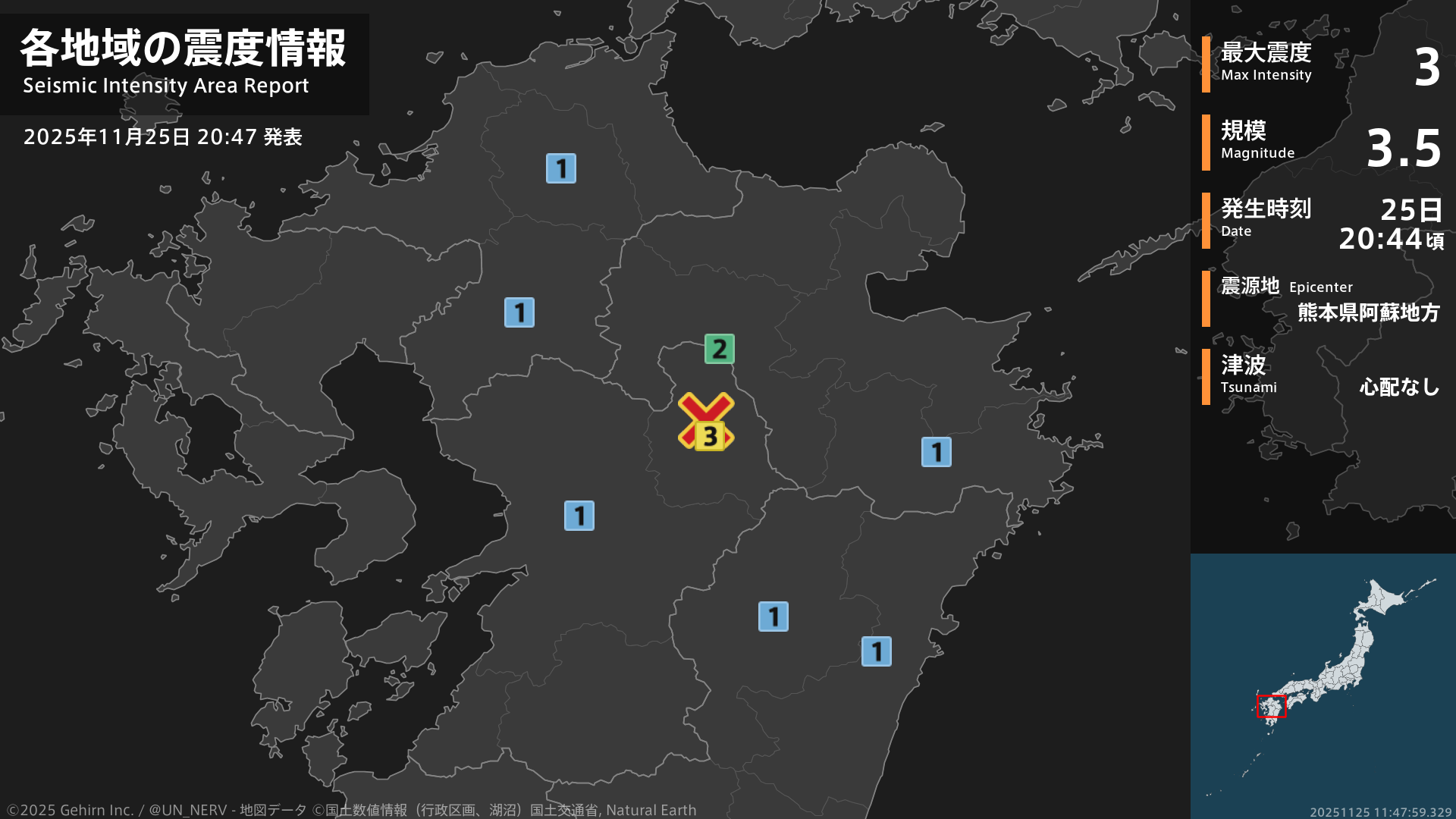 【地震情報 2025年11月25日】20時44分頃、熊本県阿蘇地方を震源とする地震がありました。震源の深さは約10km、地震の規模はM3.5、最大震度3を熊本県で観測しています。この地震による津波の心配はありません。#地震 #熊本県 #大分県 #福岡県 #宮崎県