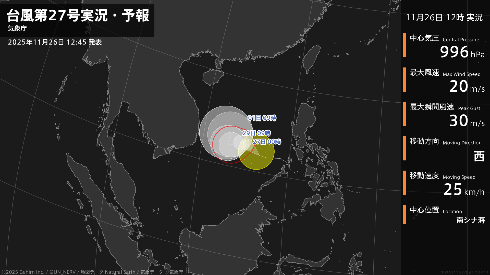 【台風第27号実況・予報 2025年11月26日 12:43】台風第27号(コト)は、南シナ海を1時間に25キロの速さで西に進んでいます。#台風情報