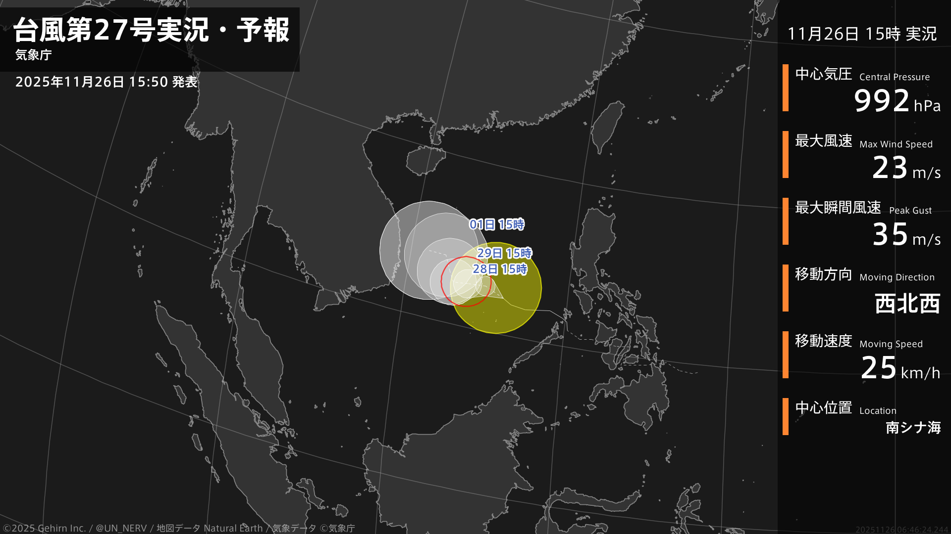 【台風第27号実況・予報 2025年11月26日 15:46】台風第27号(コト)は、南シナ海を1時間に25キロの速さで西北西に進んでいます。#台風情報