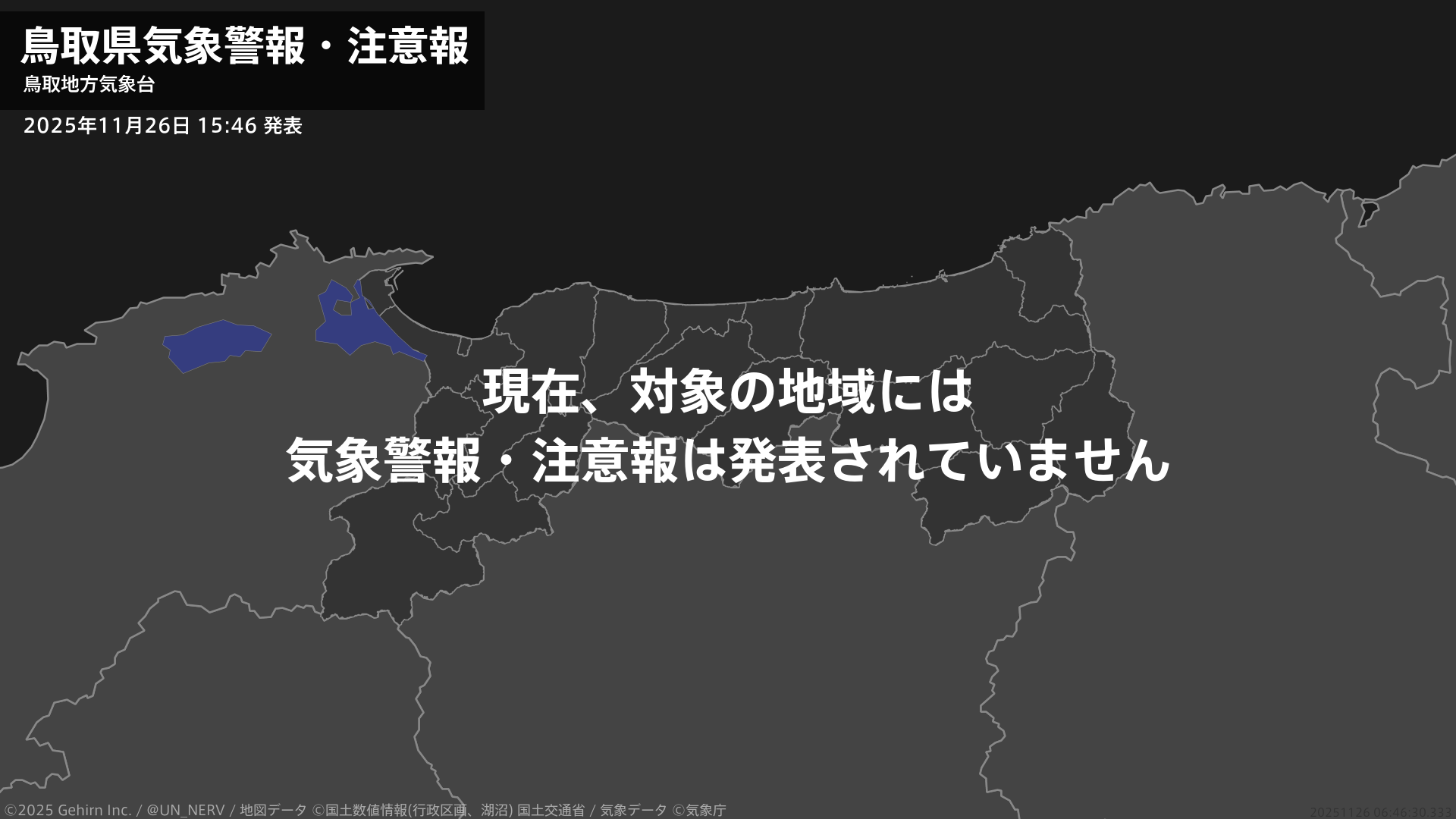 【鳥取県 気象警報・注意報 2025年11月26日 15:46】注意報を解除します。#気象警報注意報 #鳥取県