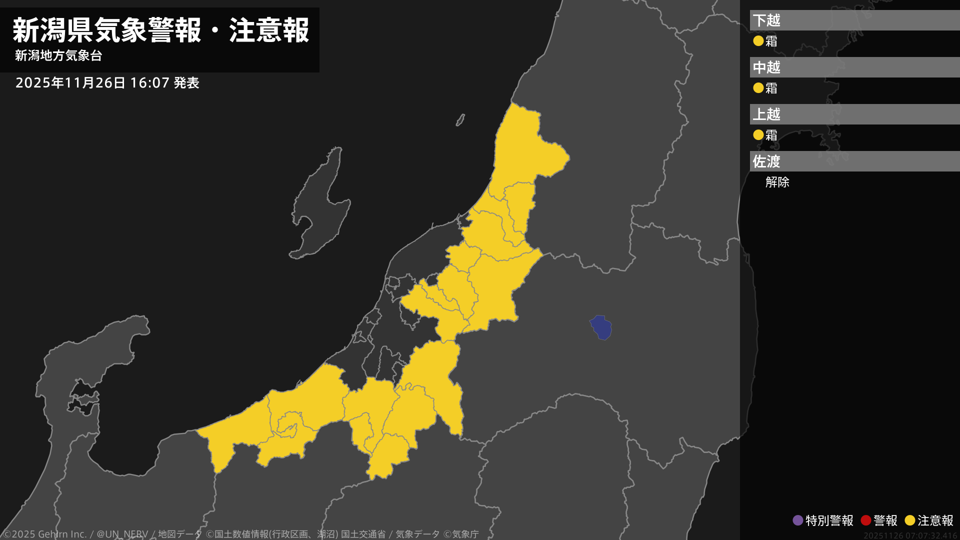 【新潟県 気象警報・注意報 2025年11月26日 16:07】下越、中越、上越では、27日朝は霜に対する農作物の管理に注意してください。#気象警報注意報 #新潟県