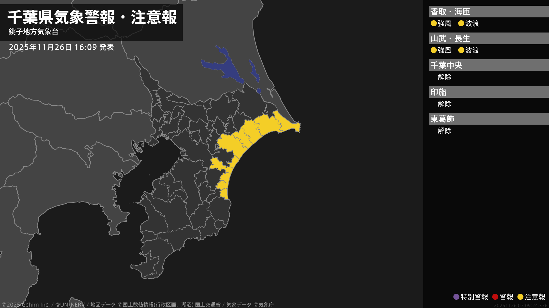 【千葉県 気象警報・注意報 2025年11月26日 16:09】北東部では、26日夜のはじめ頃まで強風に、27日明け方まで高波に注意してください。#気象警報注意報 #千葉県