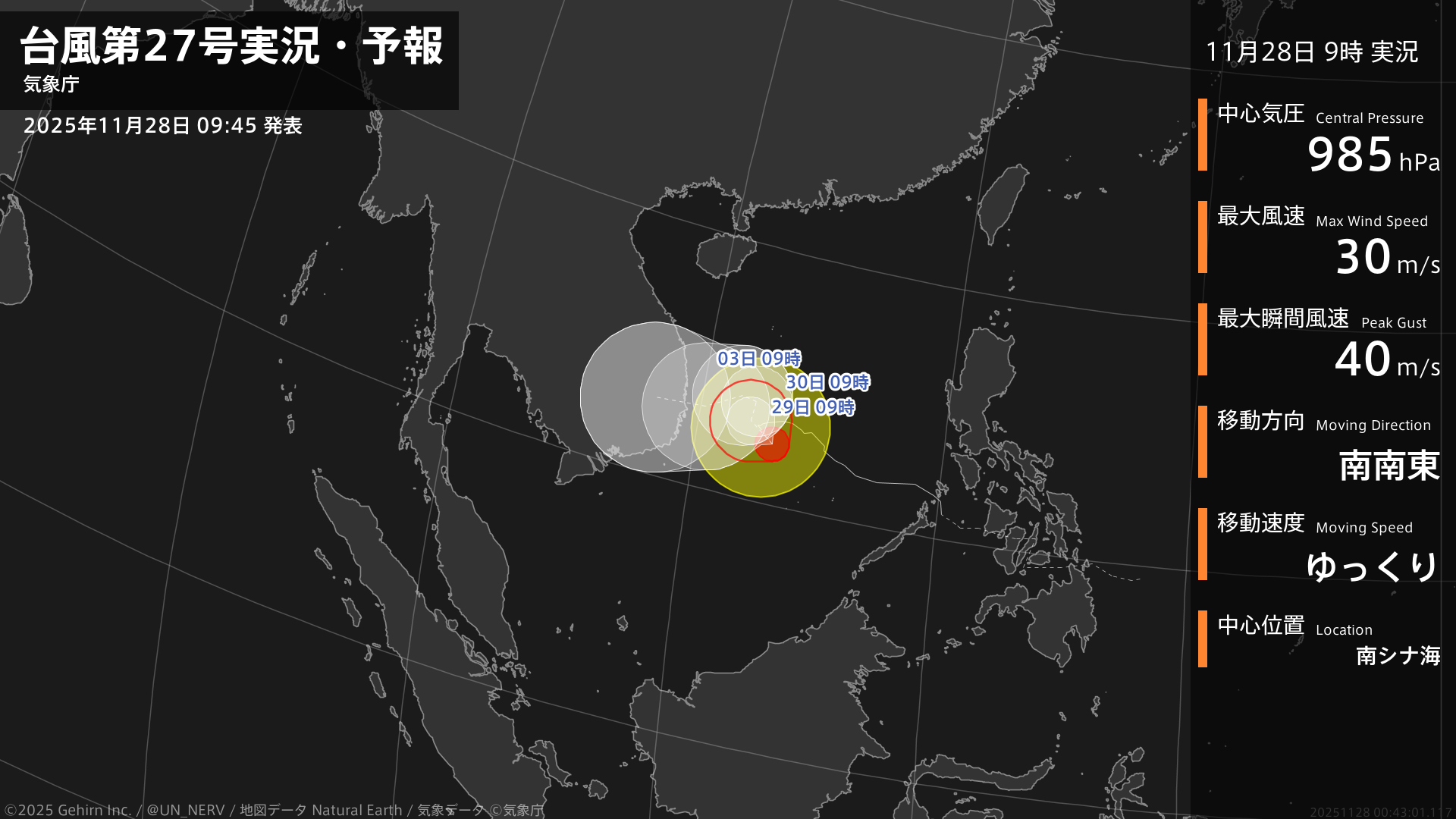 【台風第27号実況・予報 2025年11月28日 09:43】台風第27号(コト)は、南シナ海をゆっくりと南南東に進んでいます。#台風情報