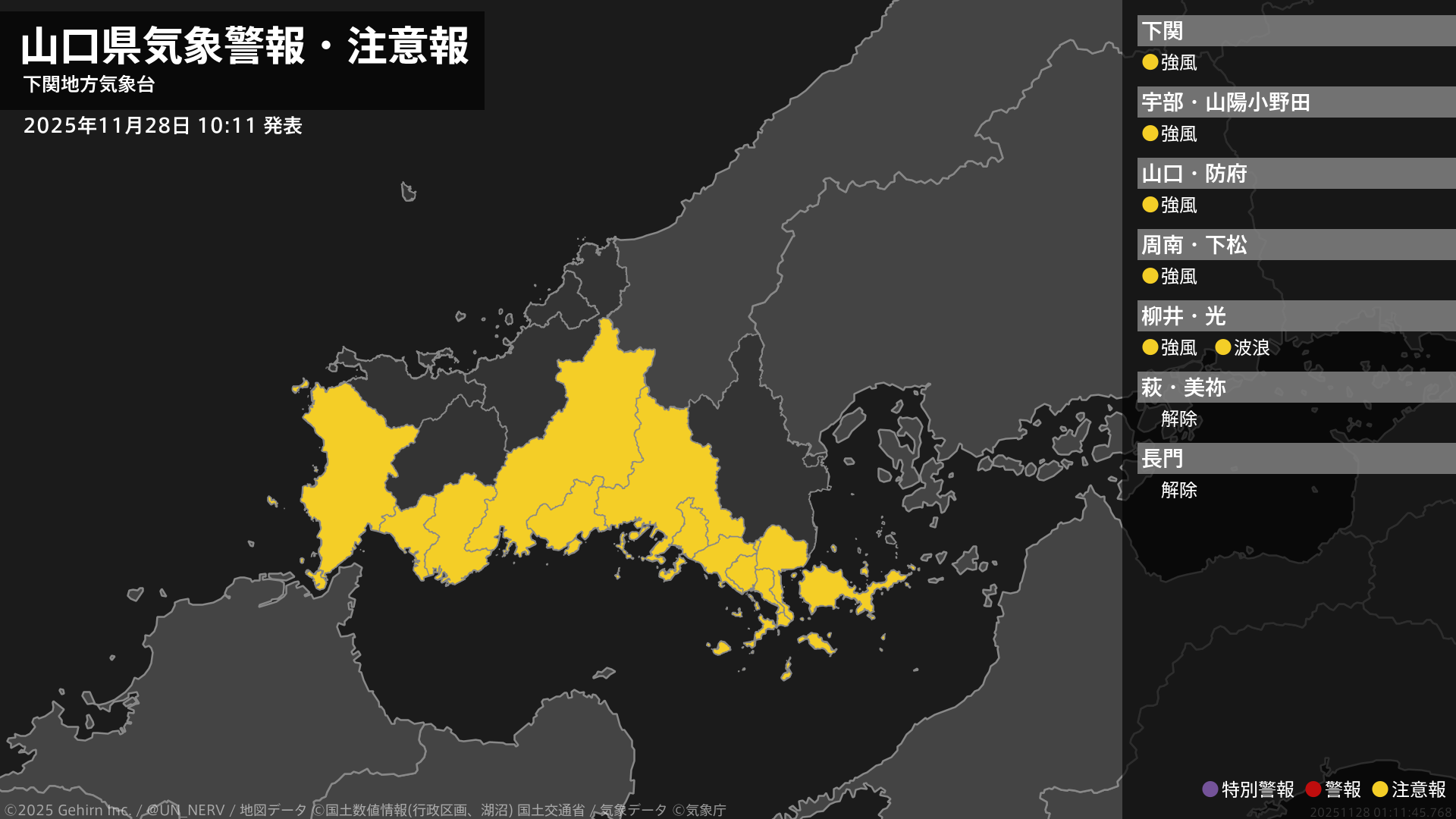 【山口県 気象警報・注意報 2025年11月28日 10:11】西部、中部、東部では、28日昼過ぎまで強風に注意してください。東部では、28日昼過ぎまで高波に注意してください。#気象警報注意報 #山口県