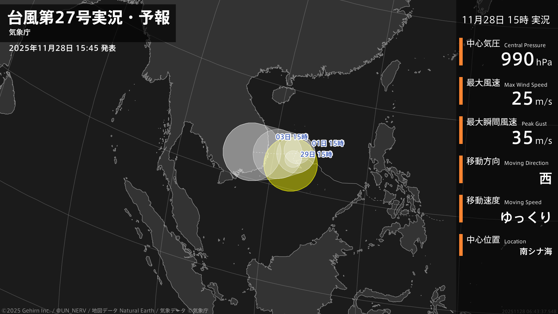 【台風第27号実況・予報 2025年11月28日 15:43】台風第27号(コト)は、南シナ海をゆっくりと西に進んでいます。#台風情報