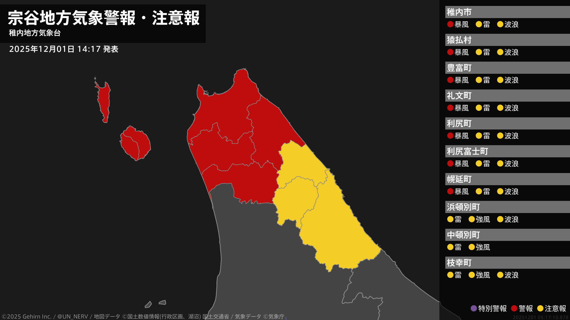 【宗谷地方 気象警報・注意報 2025年12月01日 14:17】