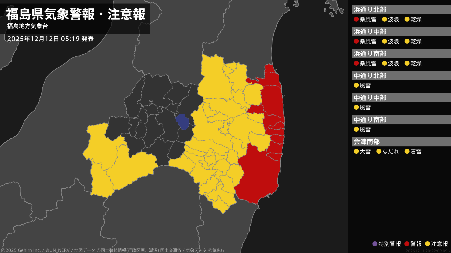 【福島県 気象警報・注意報 2025年12月12日 05:22】福島県の海上では、12日朝まで暴風雪に警戒してください。#気象警報注意報 #福島県