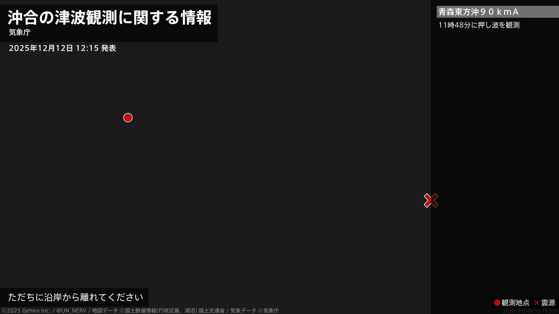 【沖合で津波を観測 2025年12月12日 12:15】沖合で津波を観測しました。[青森東方沖90kmA]11時48分に押し波を観測#津波 #沖合津波観測報