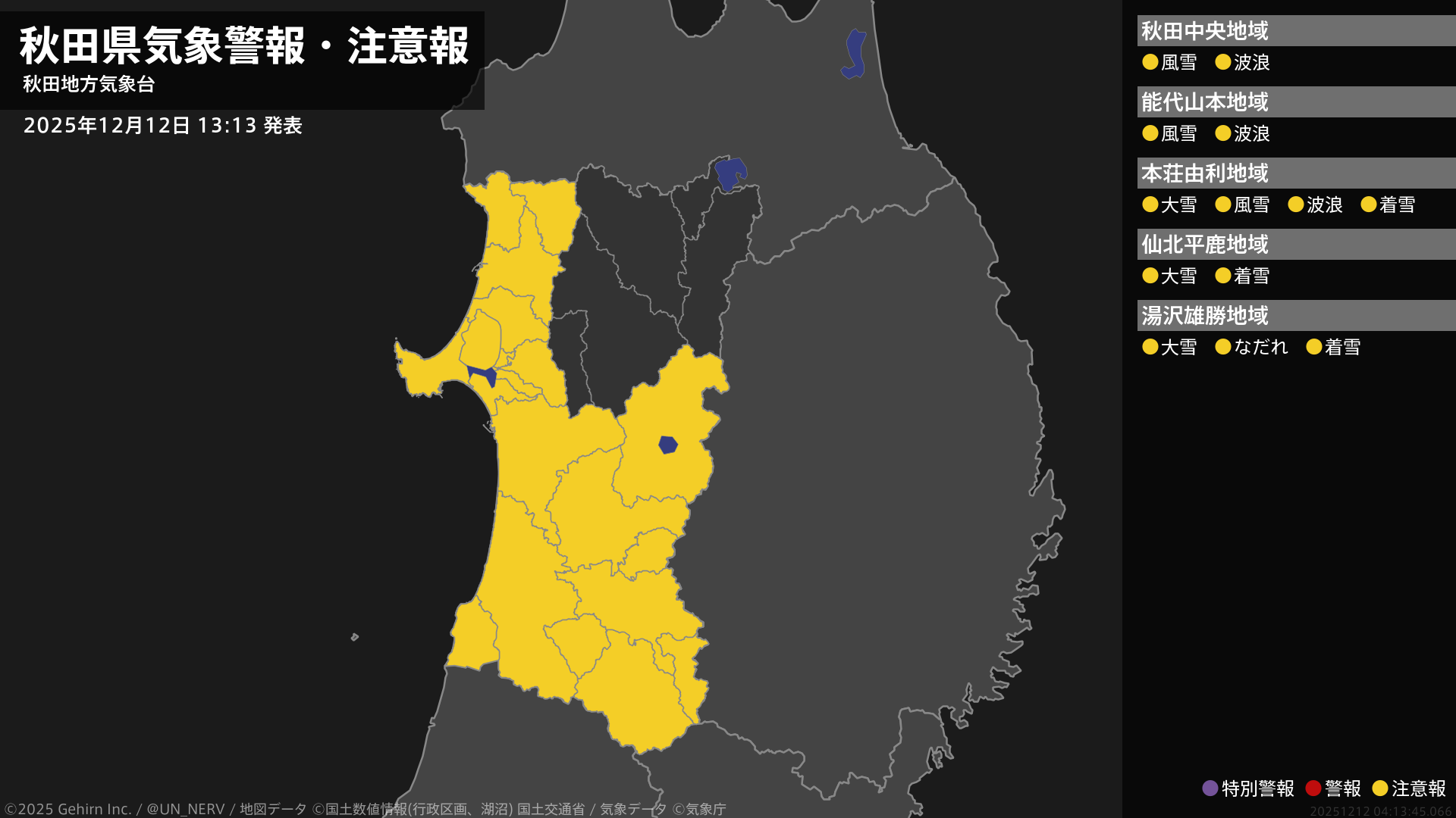 【秋田県 気象警報・注意報 2025年12月12日 13:13】沿岸では、風雪や高波に注意してください。秋田県では、大雪や電線等への着雪に注意してください。内陸では、なだれに注意してください。#気象警報注意報 #秋田県