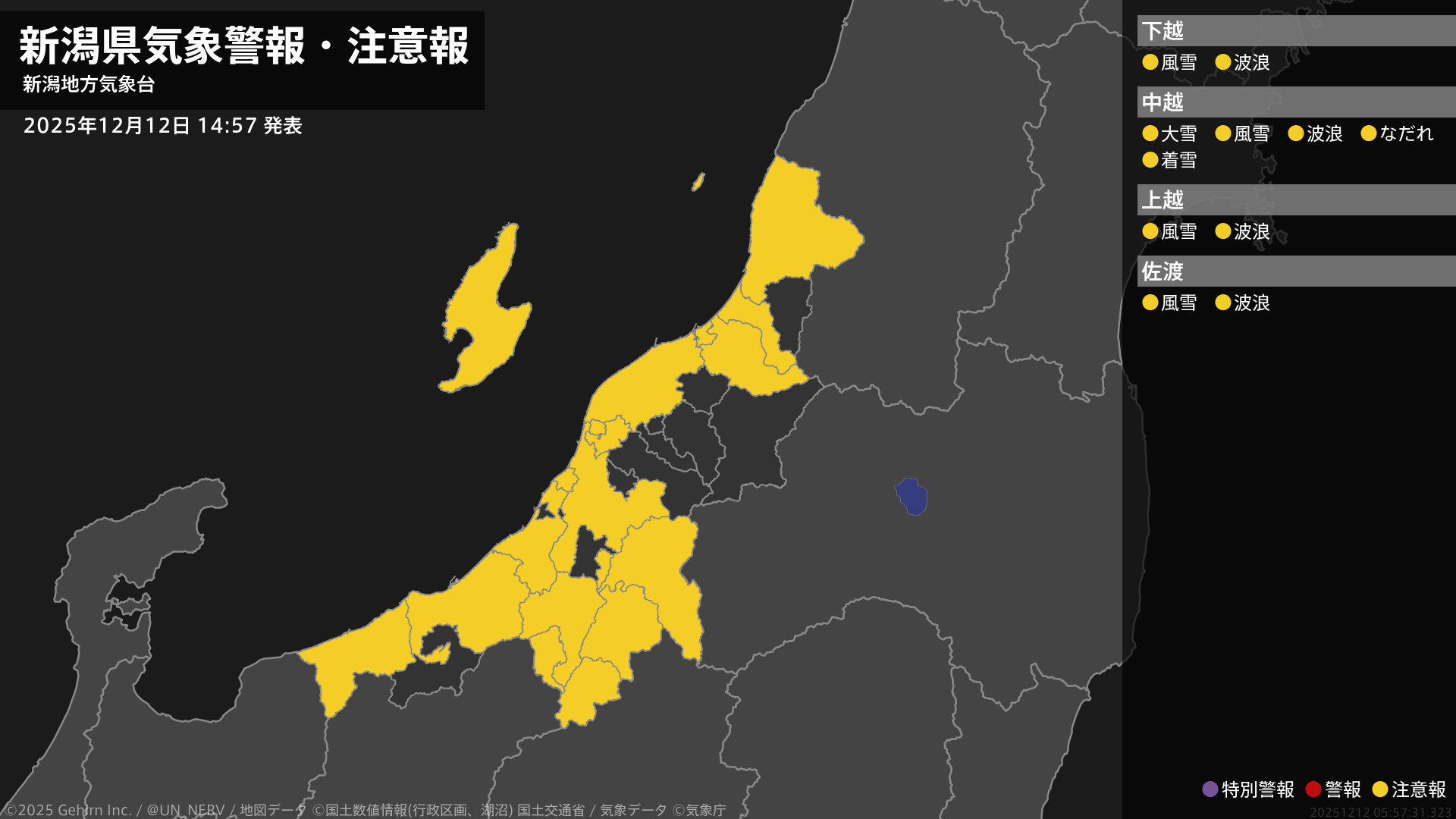 【新潟県 気象警報・注意報 2025年12月12日 14:57】新潟県では、風雪や高波に注意してください。中越では、大雪やなだれ、電線等への着雪に注意してください。#気象警報注意報 #新潟県