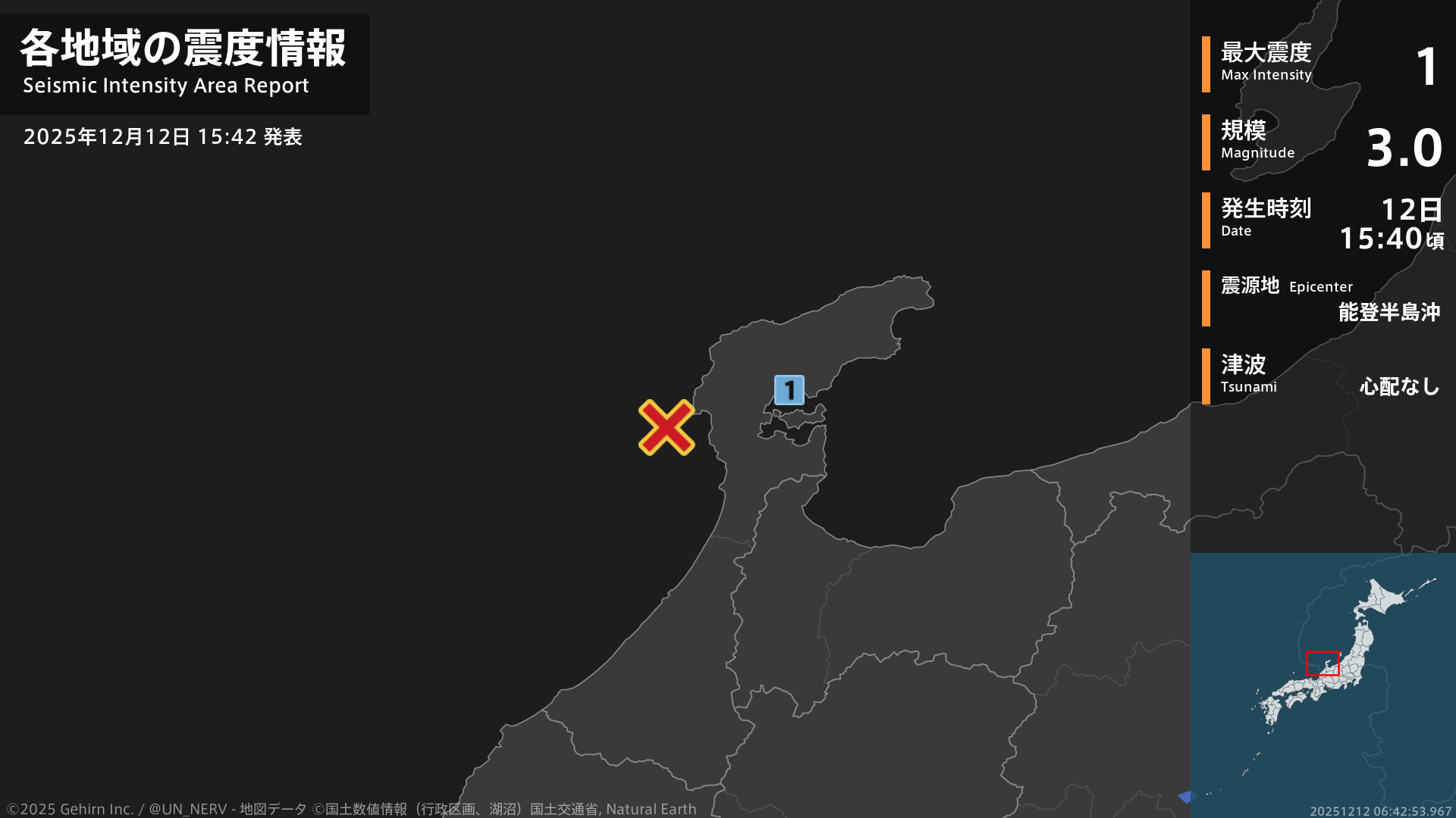 【地震情報 2025年12月12日】15時40分頃、能登半島沖を震源とする地震がありました。震源の深さは約10km、地震の規模はM3.0、最大震度1を石川県で観測しています。この地震による津波の心配はありません。#地震 #石川県