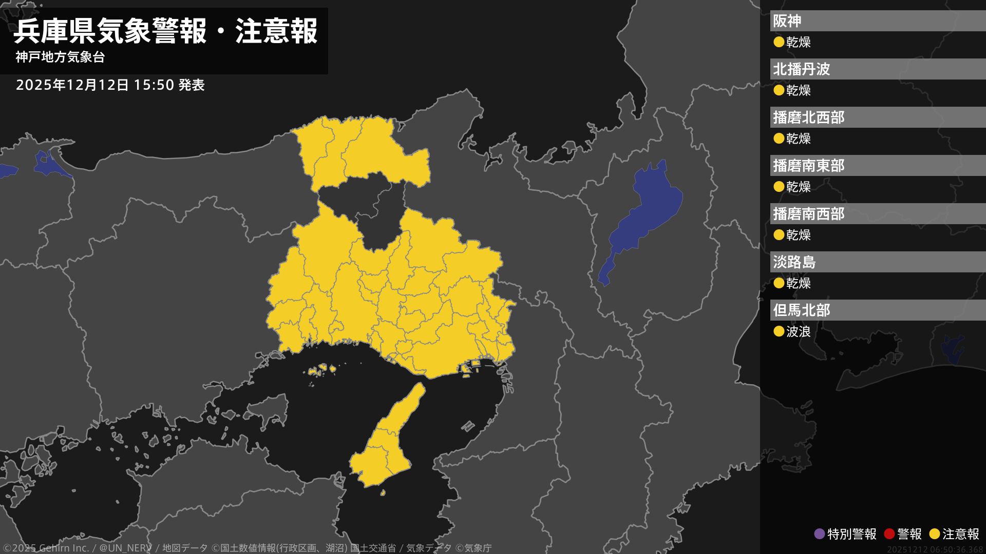 【兵庫県 気象警報・注意報 2025年12月12日 15:50】