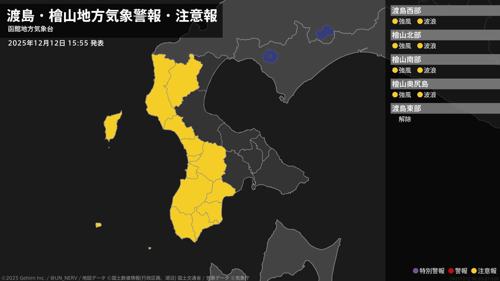 【渡島・檜山地方 気象警報・注意報 2025年12月12日 15:55】