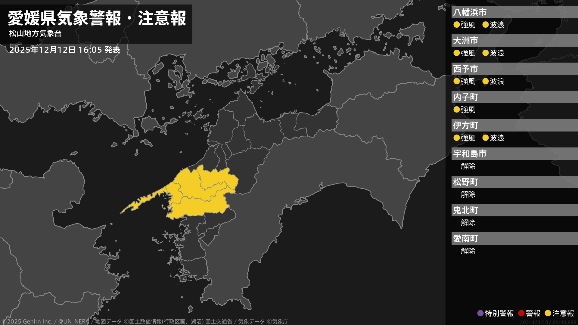 【愛媛県 気象警報・注意報 2025年12月12日 16:05】