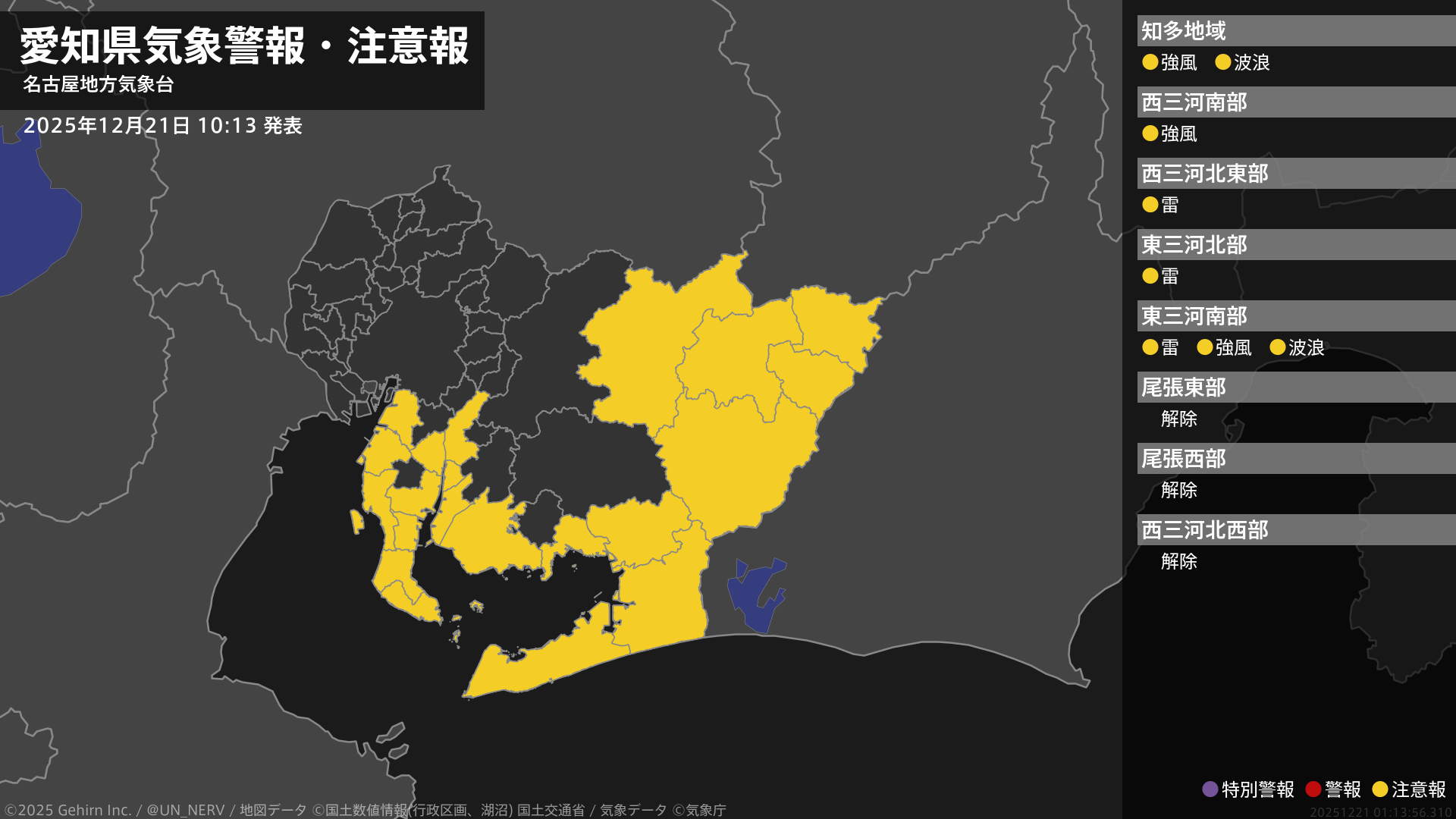 【愛知県 気象警報・注意報 2025年12月21日 10:13】愛知県では、強風や高波に注意してください。東部では、急な強い雨や落雷に注意してください。#気象警報注意報 #愛知県