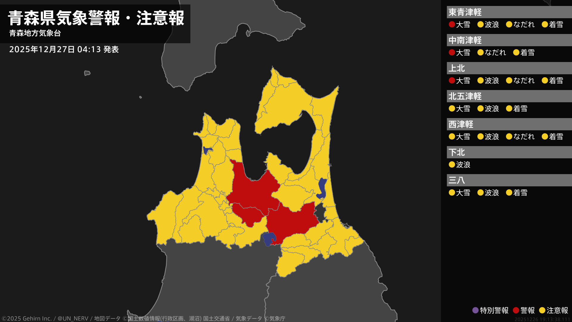 【青森県 気象警報・注意報 2025年12月27日 04:13】
