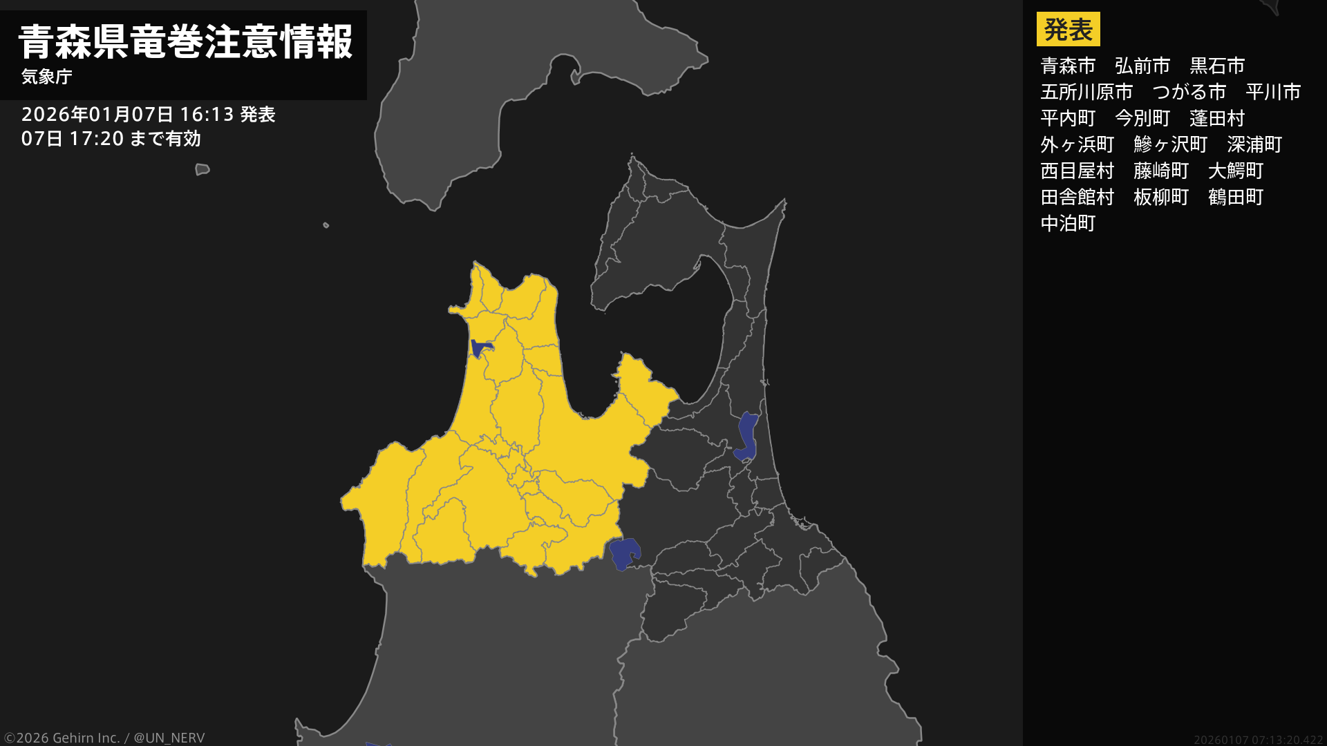 【青森県 竜巻注意情報】青森県は、竜巻などの激しい突風が発生しやすい気象状況になっています。頑丈な建物内に移動するなど安全確保に努めてください。この情報は07日17:20まで有効です。#竜巻注意情報 #青森県