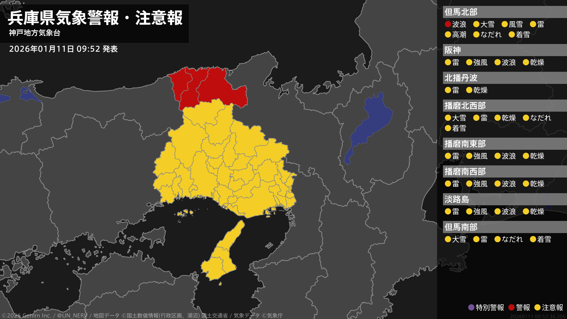 【兵庫県 気象警報・注意報 2026年01月11日 09:52】北部では、12日明け方まで高波に警戒してください。#気象警報注意報 #兵庫県
