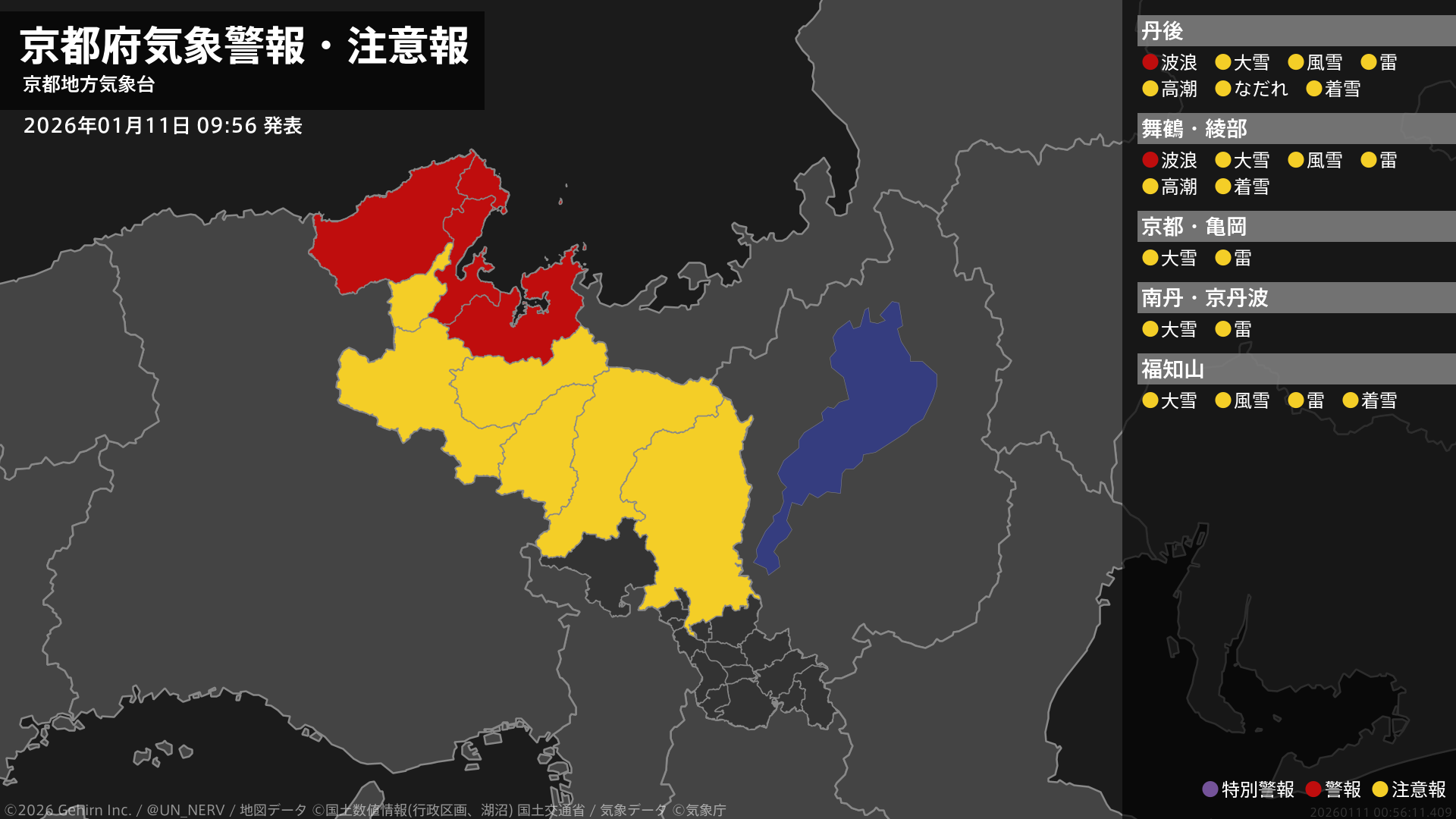 【京都府 気象警報・注意報 2026年01月11日 09:56】北部では、12日明け方まで高波に警戒してください。#気象警報注意報 #京都府