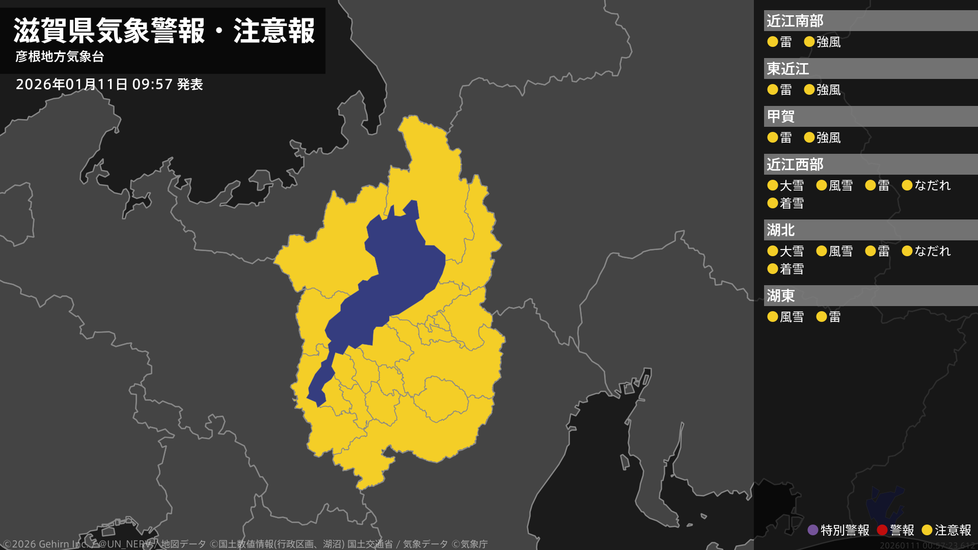 【滋賀県 気象警報・注意報 2026年01月11日 09:57】南部では、強風に注意してください。北部では、風雪や大雪、なだれ、電線等への着雪に注意してください。滋賀県では、竜巻などの激しい突風や落雷に注意してください。#気象警報注意報 #滋賀県