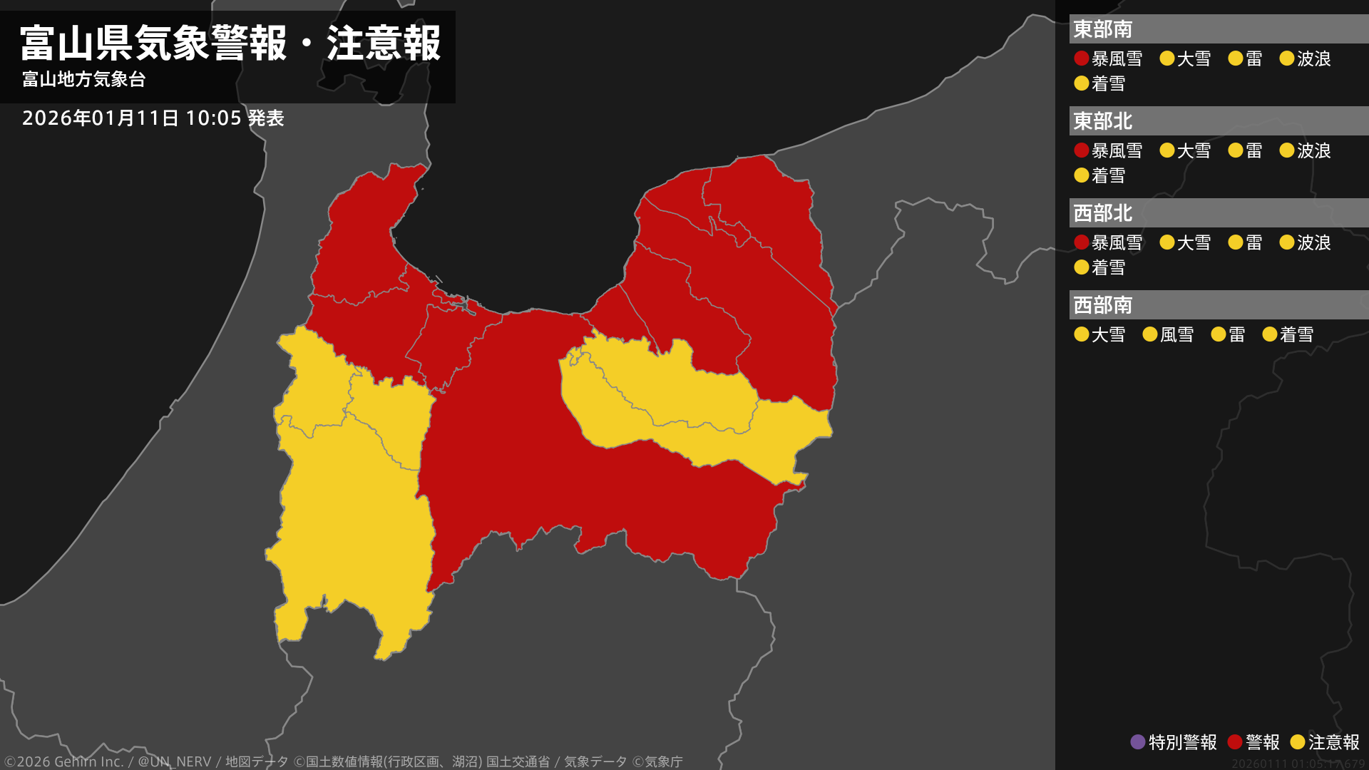 【富山県 気象警報・注意報 2026年01月11日 10:05】富山県の海上では、11日夕方まで暴風雪に警戒してください。#気象警報注意報 #富山県